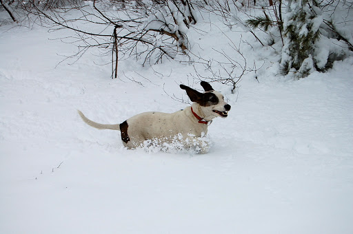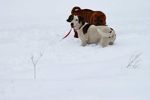 From the mailbox I acquiesced to Alice and started down the road. All the neighbor’s driveways looked like mine, covered with snow, but theirs had sliding tire marks. We walked to a neighbor’s cabin. He was just heading out as we turned down his long driveway. He invited us in but first Alice and Slinky needed playtime. “Slinks” is a beautiful dog of unknown origin who displays a bent toward Basset Hound. She’s a charmer with her wonky eye and love of attention.
