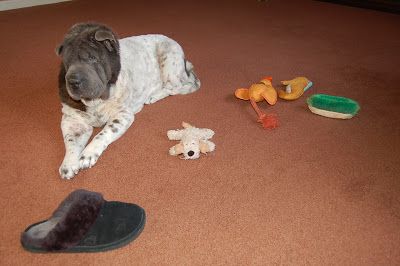 The dogs strew toys everywhere.   Their definition of “their toys” now include horse brushes, saddle pads, and my slippers.