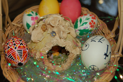 I decorated with duck eggs we had painstakingly pierced and blown out years ago.  They were “interestingly” decorated, including one egg sporting the Periodic Table of Elements symbol for poop by Jeff.  There were intricately painted  Russian eggs bought from a street vendor in Harvard Square and a huge spun sugar egg with a diorama inside.