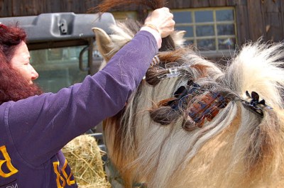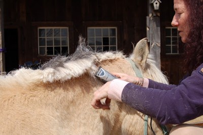 After a good grooming to loosen the dirt, I conjured up my best memories of the YouTube video I’d watched on how to clip a Fjord and set to work.  Big hair clips? Check!  Scissors and clippers? Check!