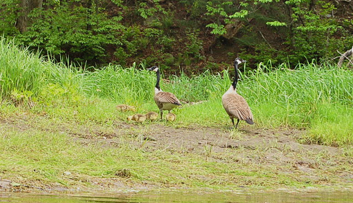 On my way back down to the bridge, a pair of Canada Geese waddled down to the shore, herding four fluffy yellow goslings. They were not terribly concerned with me as they picked at the tender green shoots and stomped through the brush.