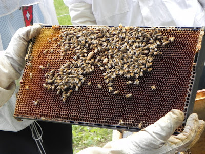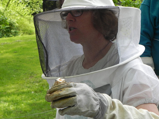 While we all suited up, Dean headed back to the workshop for the bees and equipment.  There was a fascinating array of hats, veils, shirts and gloves.  We tucked our pant-legs into our socks and headed back to the bees.