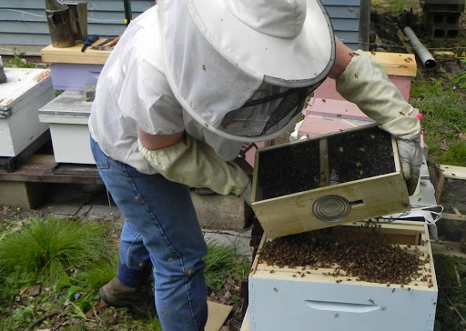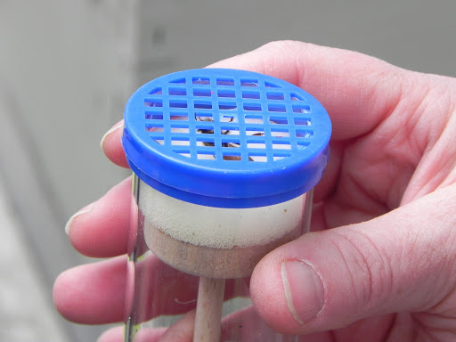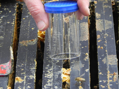 Key to this was finding the queen in each.  Once found, she was carefully removed and marked with a red dot for ease of identifying her during future checks.  One of the four hives was not very healthy.  The queen was very small and did not seem to be laying well.  The hive was visibly different from its healthier neighbor with a big fat queen.