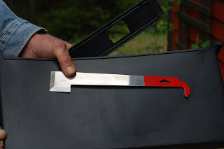 Finally, two important tools for tending the bees. A smoker is used to let the bees know you are there with a small puff before opening the hive. It also calms them. The combustible material used is pine needles and small scraps of wood. The hive tool is invaluable for prying loose sticky parts and lifting the frames.