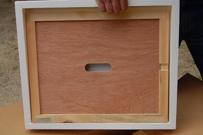 The base, or bottom board, is cedar and I immediately wanted to take it into my closet; the smell was wonderful. It includes an entrance reducer, this small piece of wood can be moved to allow more or less space for bees to enter and air to flow.