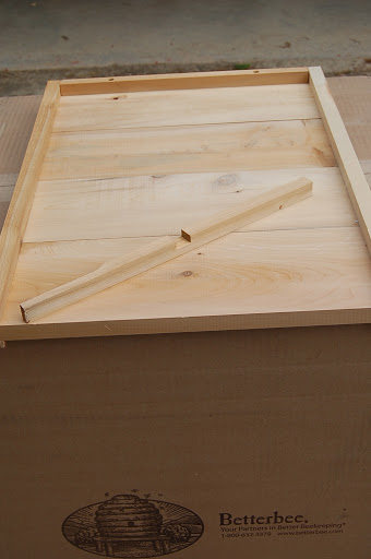 The cover for the hive in this particular kit was polystyrene, (some day soon I will replace it with copper covered pine) and included an inner pine cover. The outer cover acts like eaves of a house to protect the hive from the elements. The inner cover provides temperature control, airflow and an upper entrance.