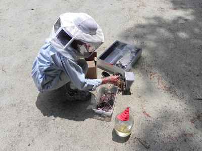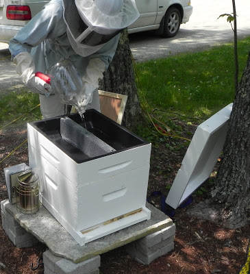 Armed with my smoker and the top feeder I headed to the hive. The feeder is designed so the bees can crawl up the screen from below and gather the syrup without getting wet. Bees don’t swim and without the screen they would drown in the liquid.