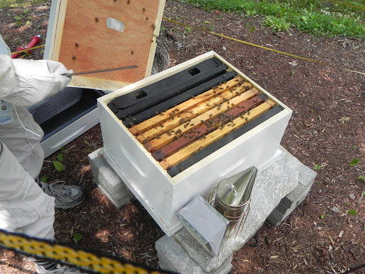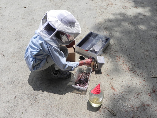 This time of year, we are between significant blooming periods. To help the bees build up their stores for the winter, I am feeding a sugar syrup. Replacing the in-hive feeder with the new feeder, required opening the whole hive.