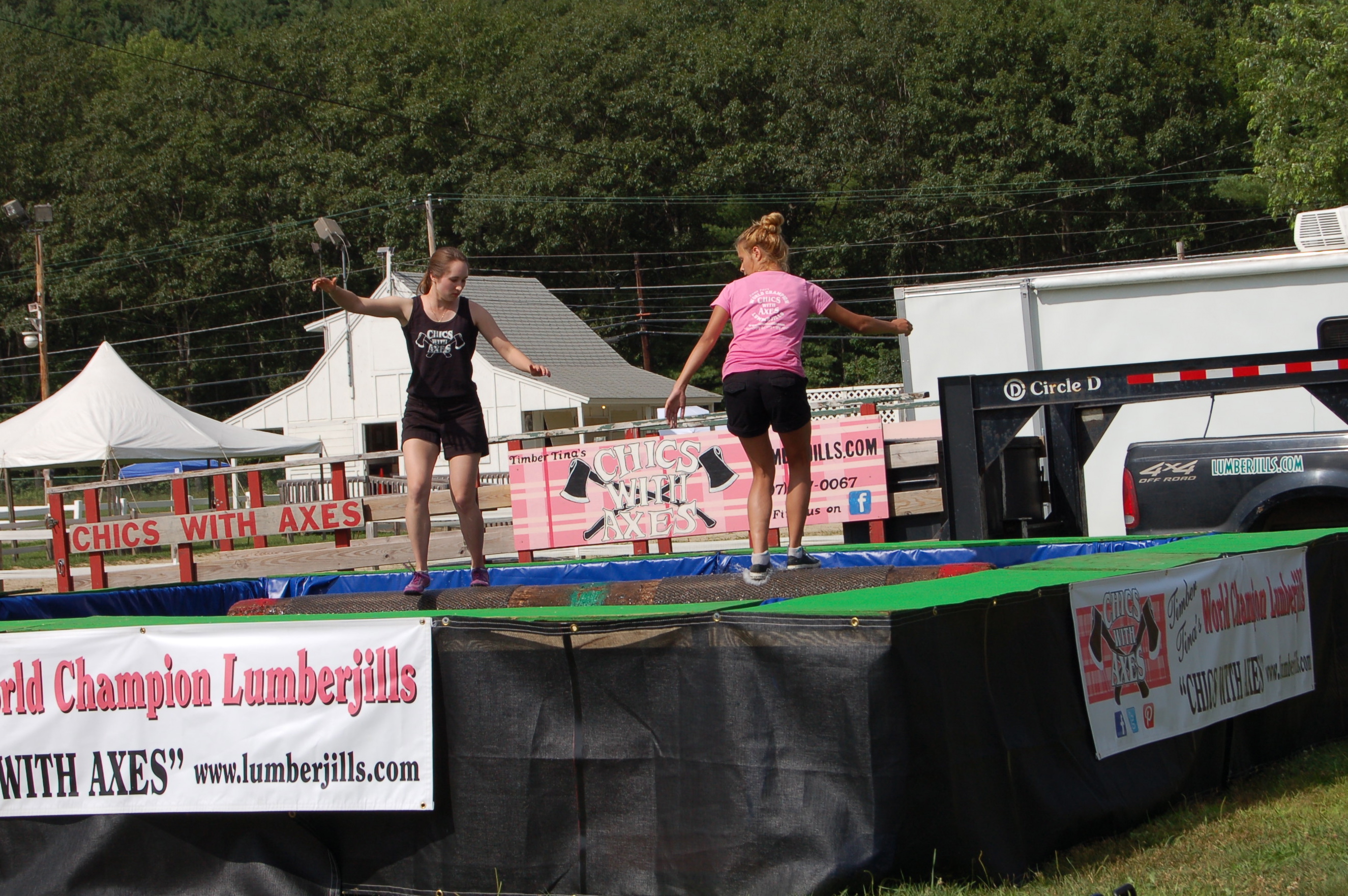 On a brighter note, when they roll into town in their big Ford dually truck emblazoned with “Chics with Axes” you can just bet they are a hit at the local pub. After a lack-luster performance of chopping, sawing and throwing, the finale was a log-rolling exhibition.  Why didn’t I expect there would be wet T-shirts involved?