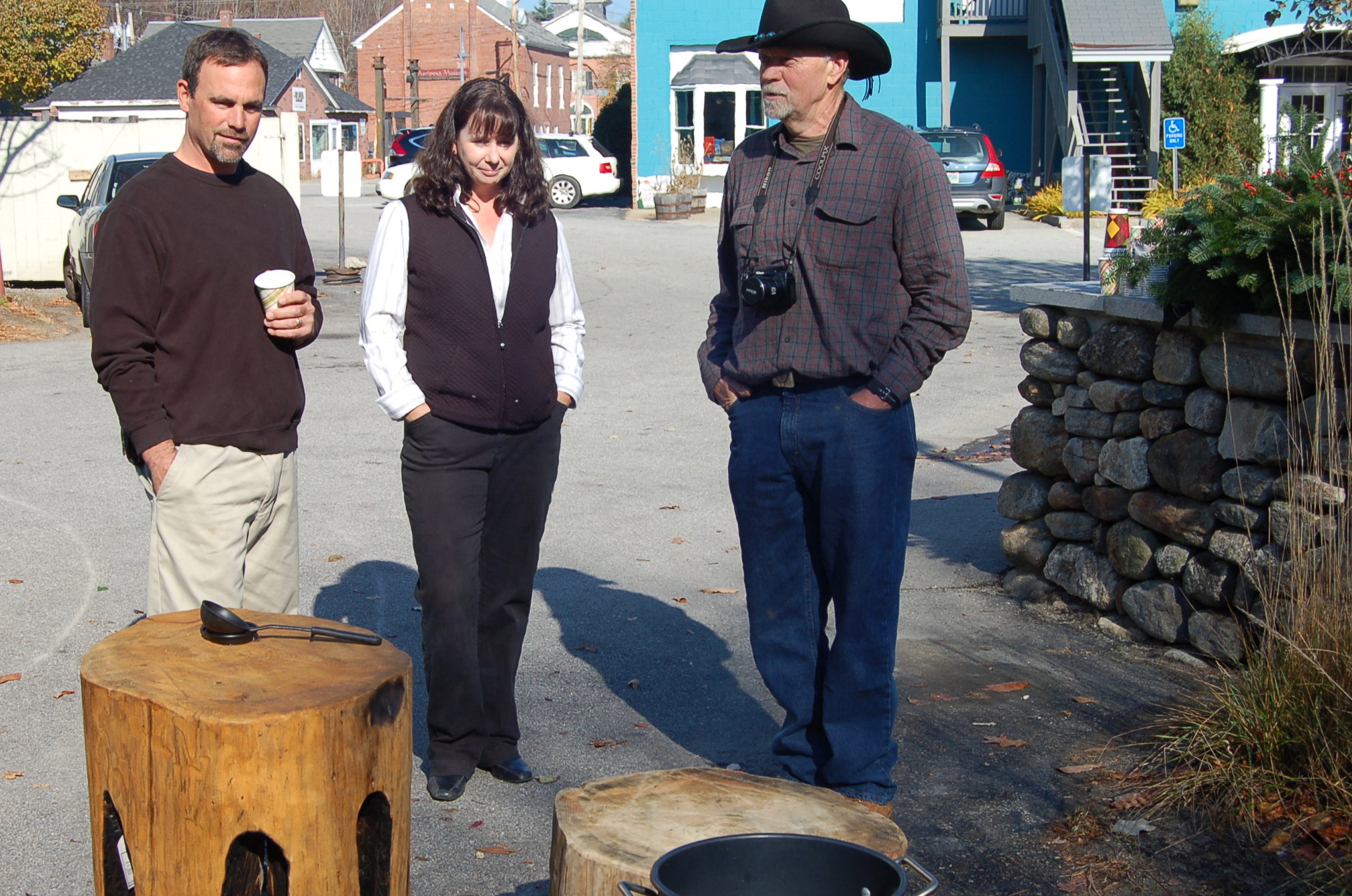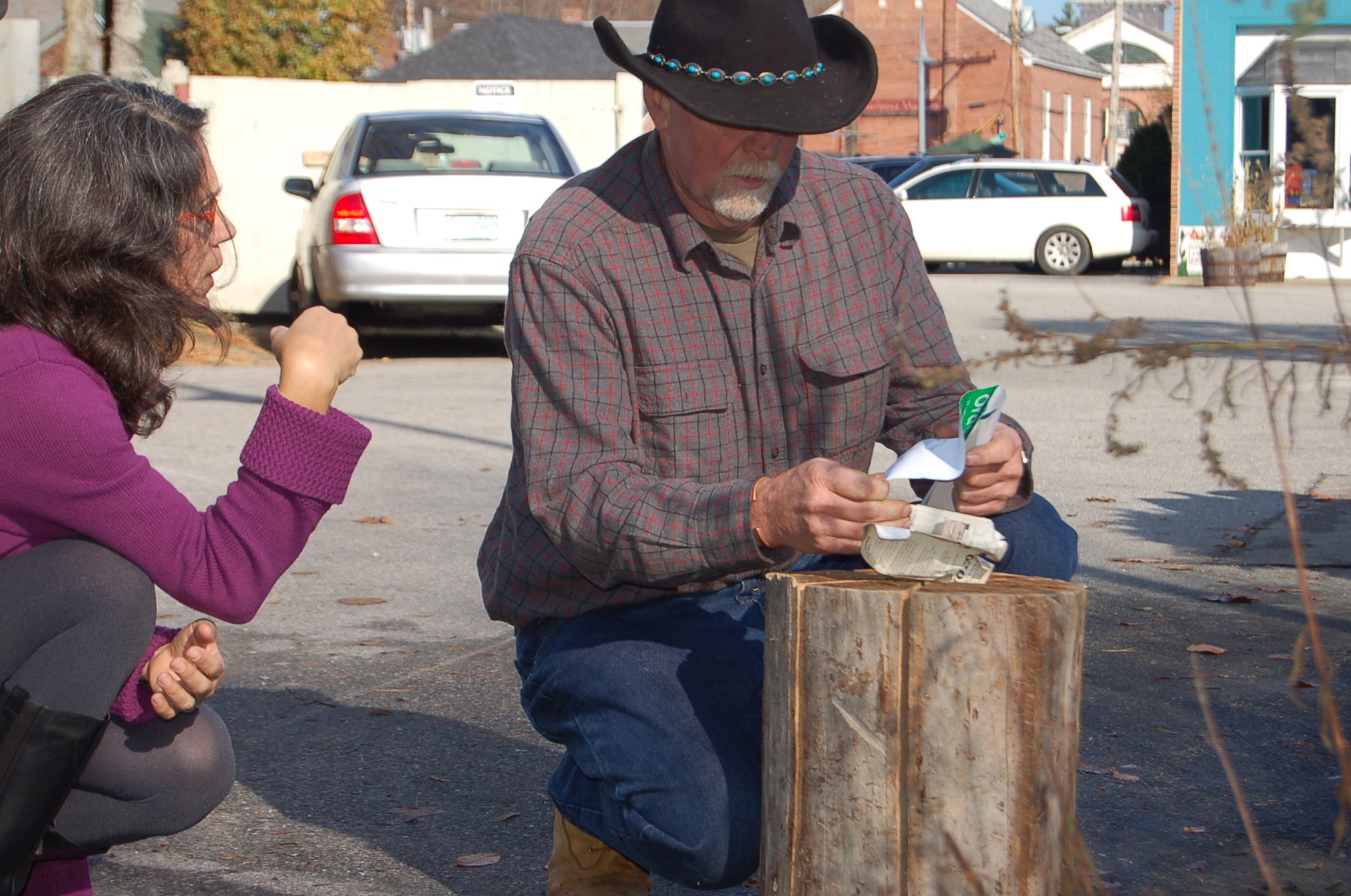 November 2nd was the fifth anniversary of Kathy Forrest’s bowerbird & friends shop in Depot Square, Peterborough.  Kathy fell in love the Schwedenfakel and wanted some for her open house. We produced ten; six ready to burn in various sizes and wood-types, and four pieces of furniture. The day of the event, Wilson got a small, black cherry log fired up. The smoke was a bit tough to deal with in the beginning; however, it leant a lovely scent to the warm fall day and attracted customers seeking the source.