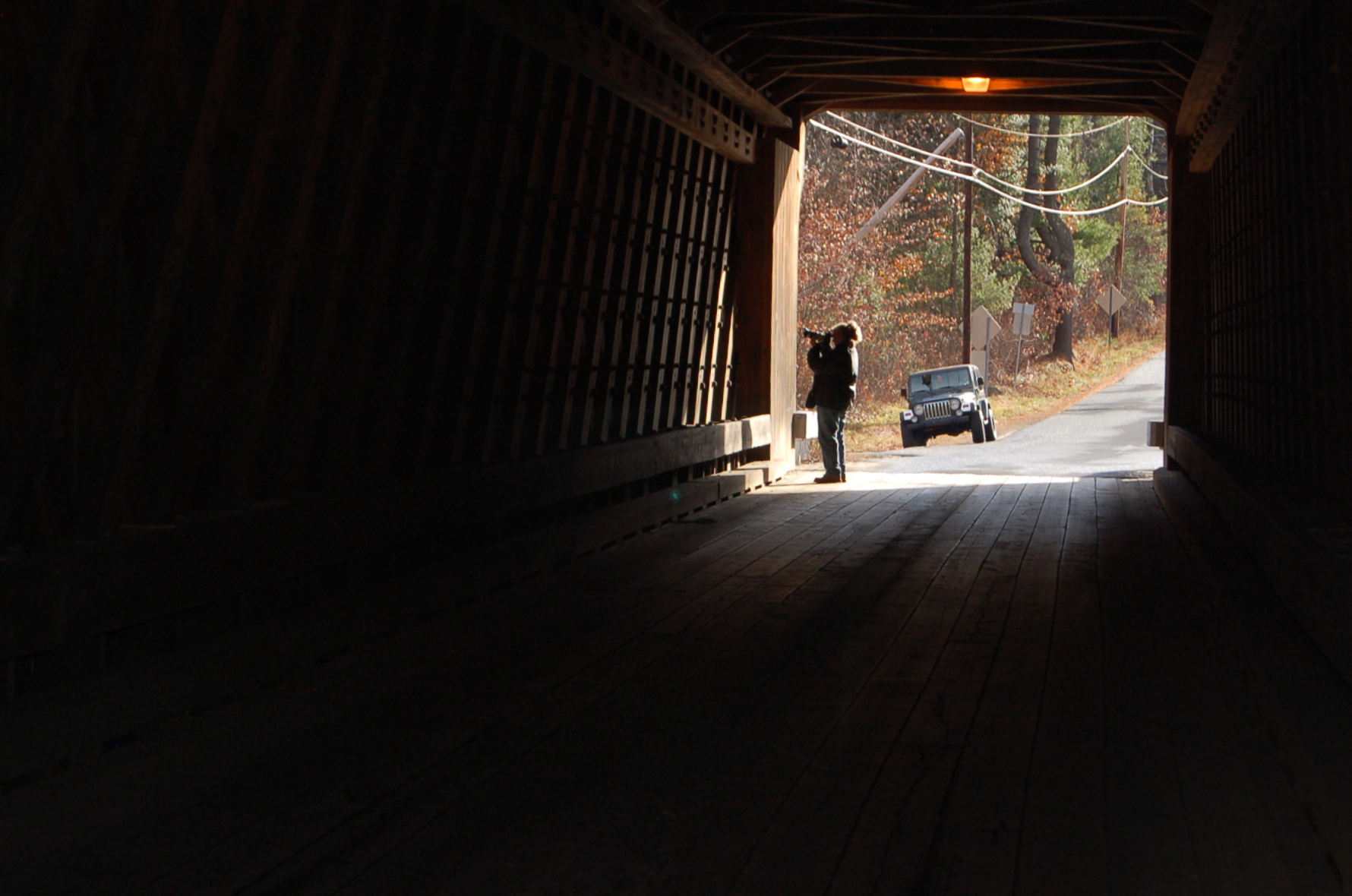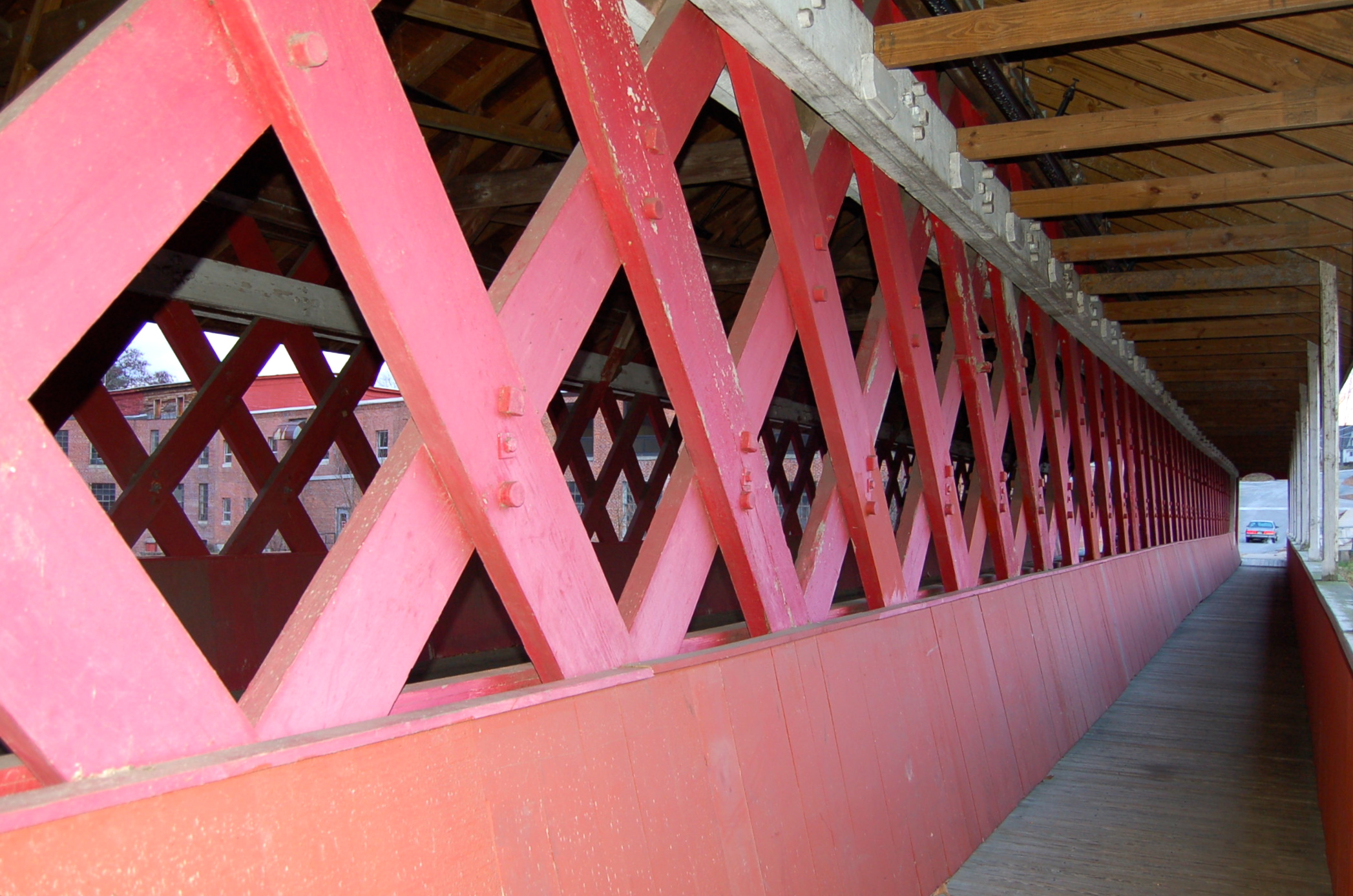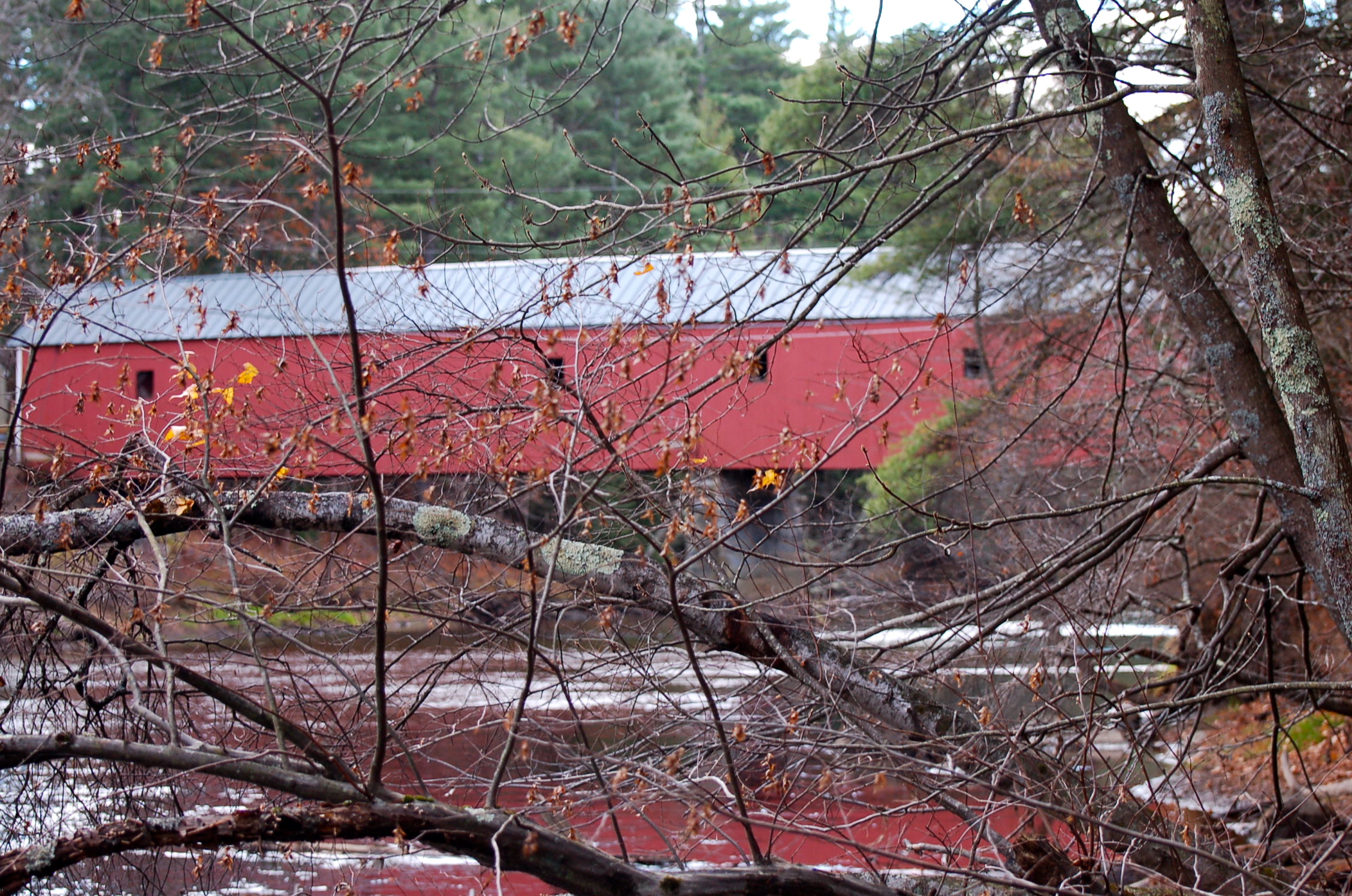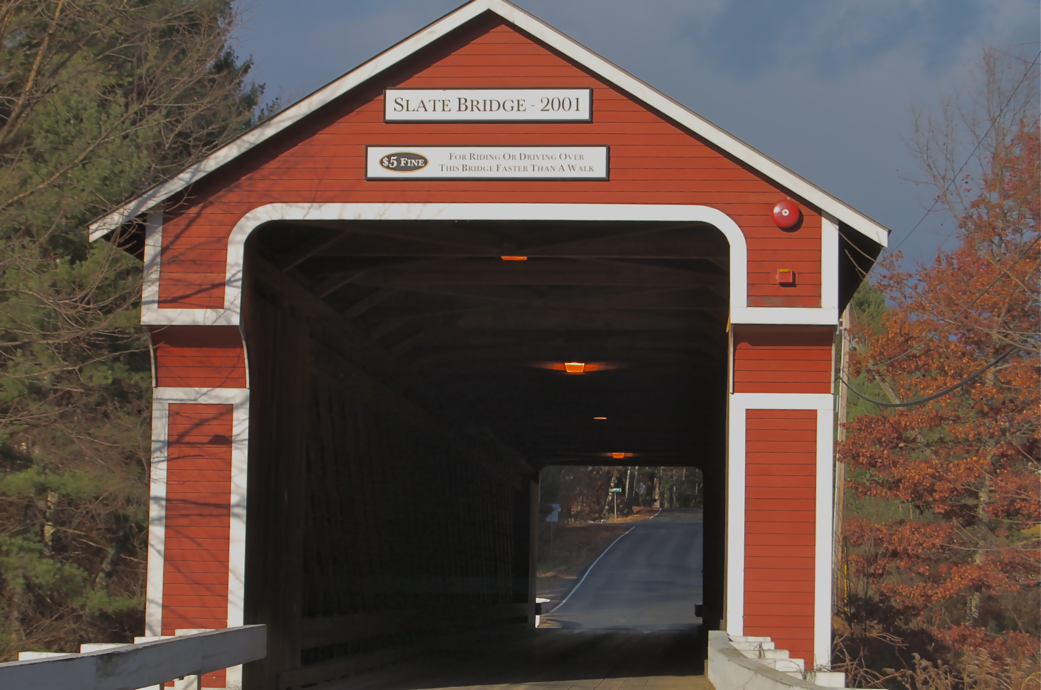 The Slate Bridge looks like it belongs in a Grandma Moses painting. Quintessential barn-red with white trim, it was destroyed by fire in 1993 and the restored version boasts a fire alarm. Lacking windows, it also has electric lights that seem to stay on all the time. I can’t imagine how devastating it must have been to watch the original burn.