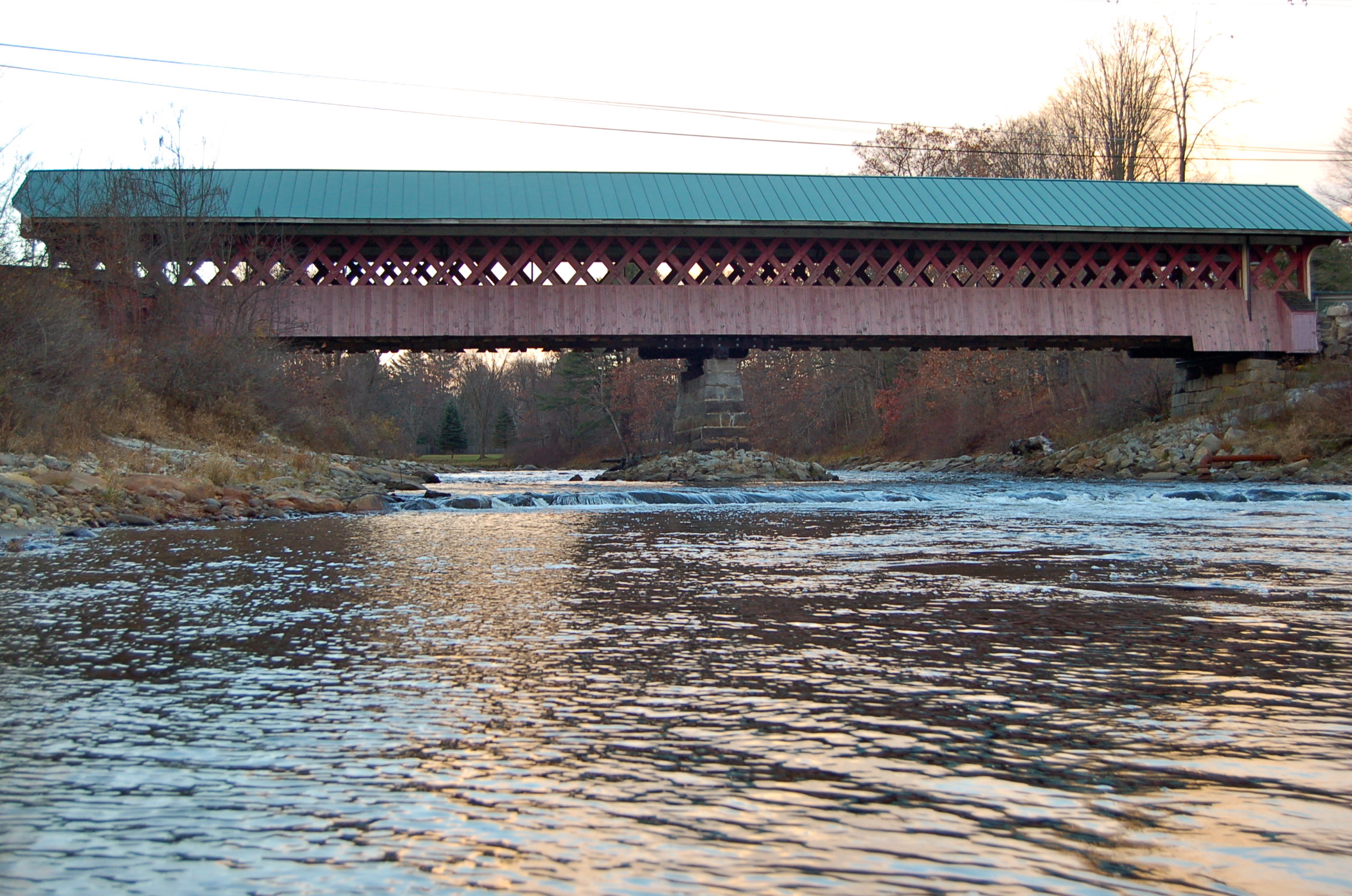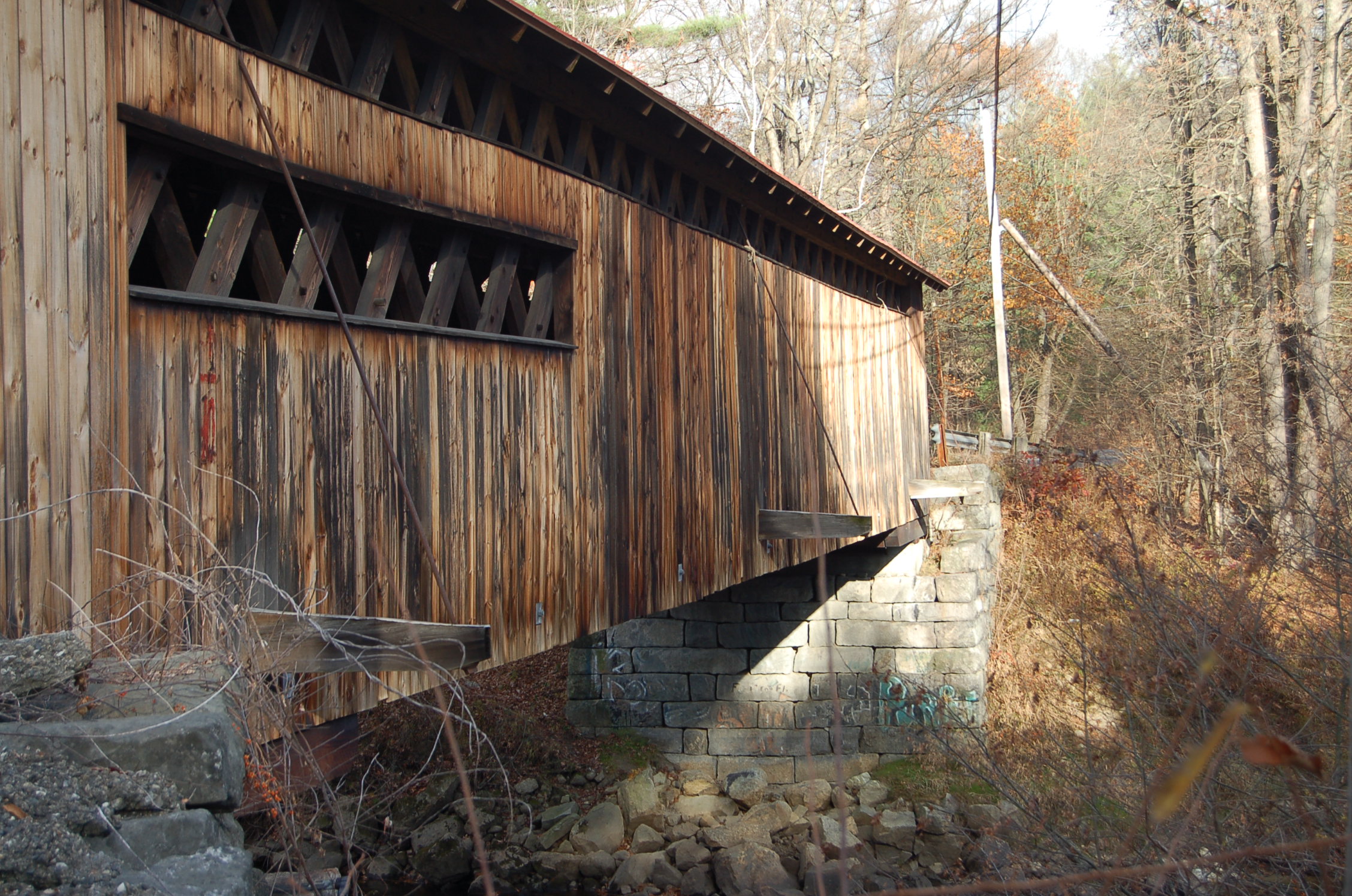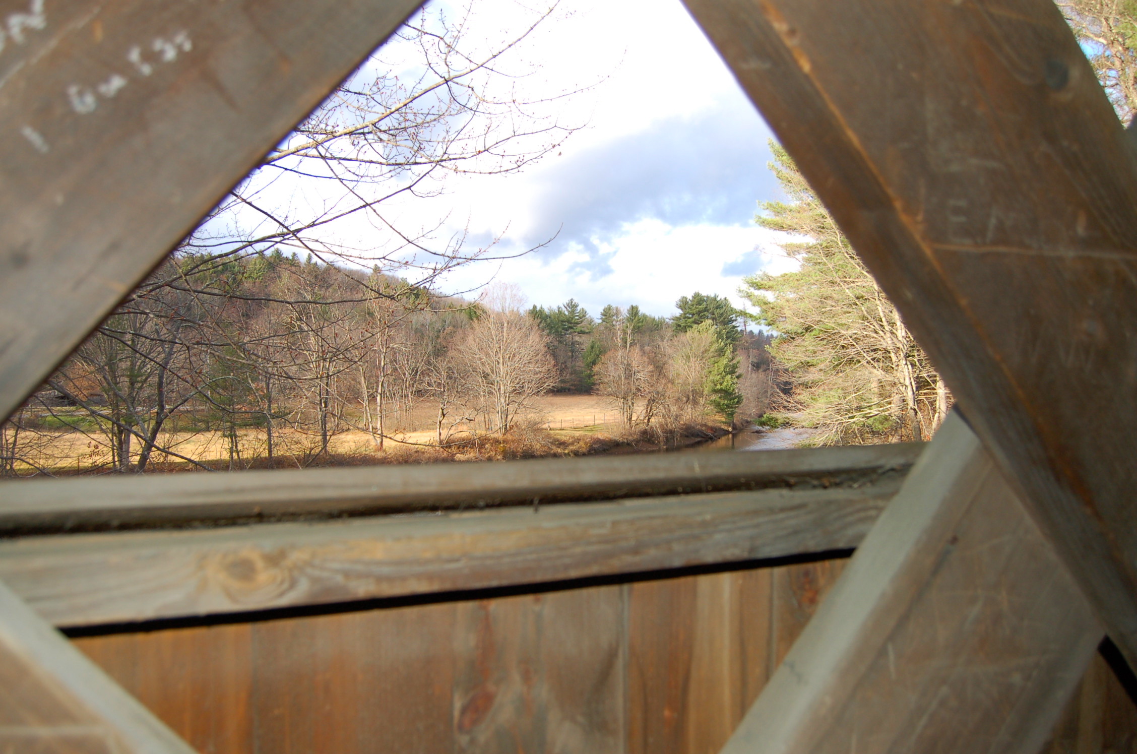 It took some doing to get ourselves psyched up for the first stop. I had visited the Cresson/Sawyer’s Crossing and the Carleton covered bridges earlier this year and wrote about it here. That first trip the weather was lovely and warm, I floated beneath the bridge in my kayak and looked up in wonder at its woodwork. This visit the drizzle was cold, the wind insistent and the Ashuelot River low and muddy. Even these conditions couldn’t take away from the marvel of the construction. These first two bridges are very similar, so much so, I was confused when I went through my photos initially and couldn’t tell them apart. The Cresson has many small windows where as the Carleton has just two on the north side.