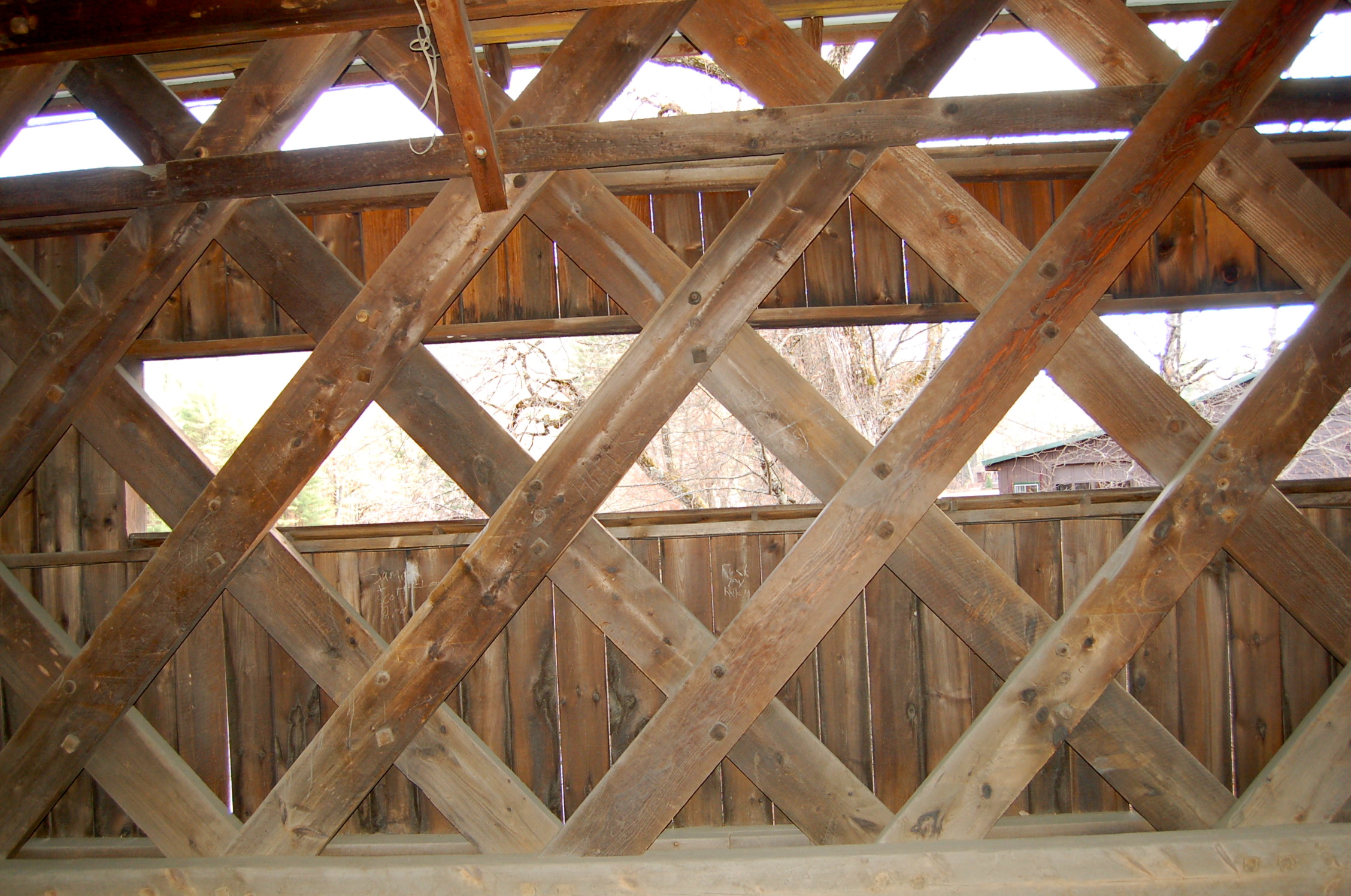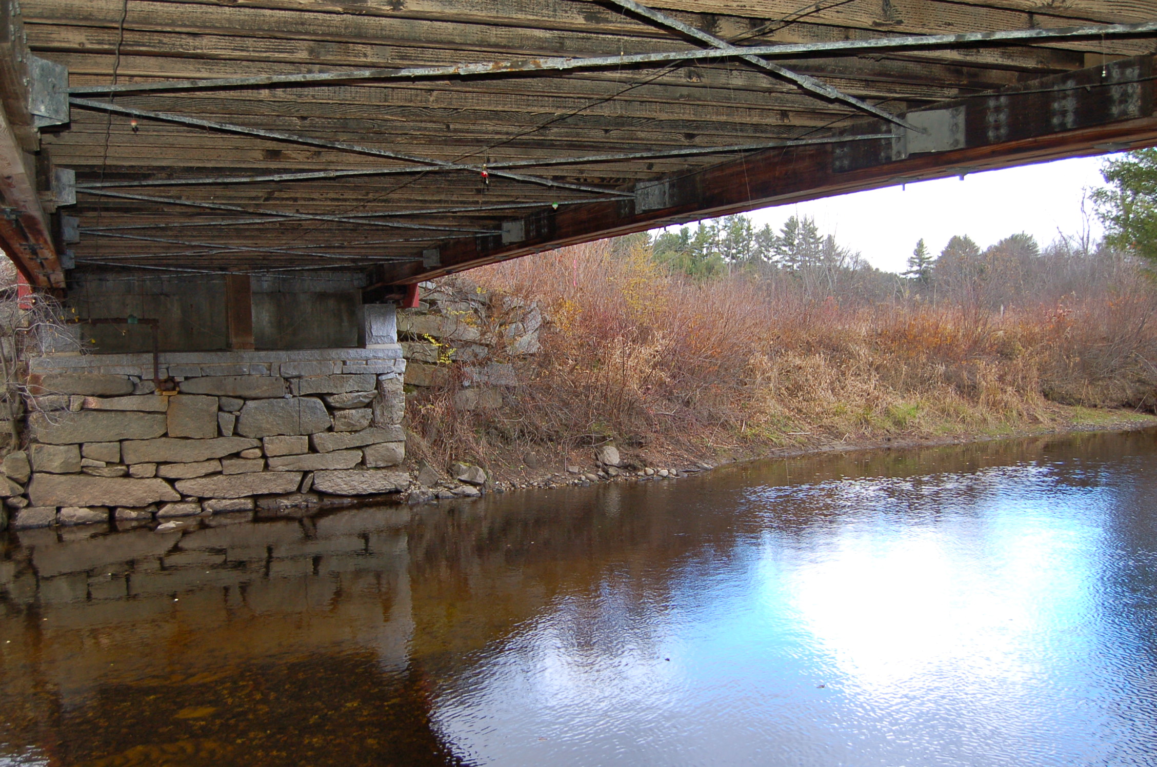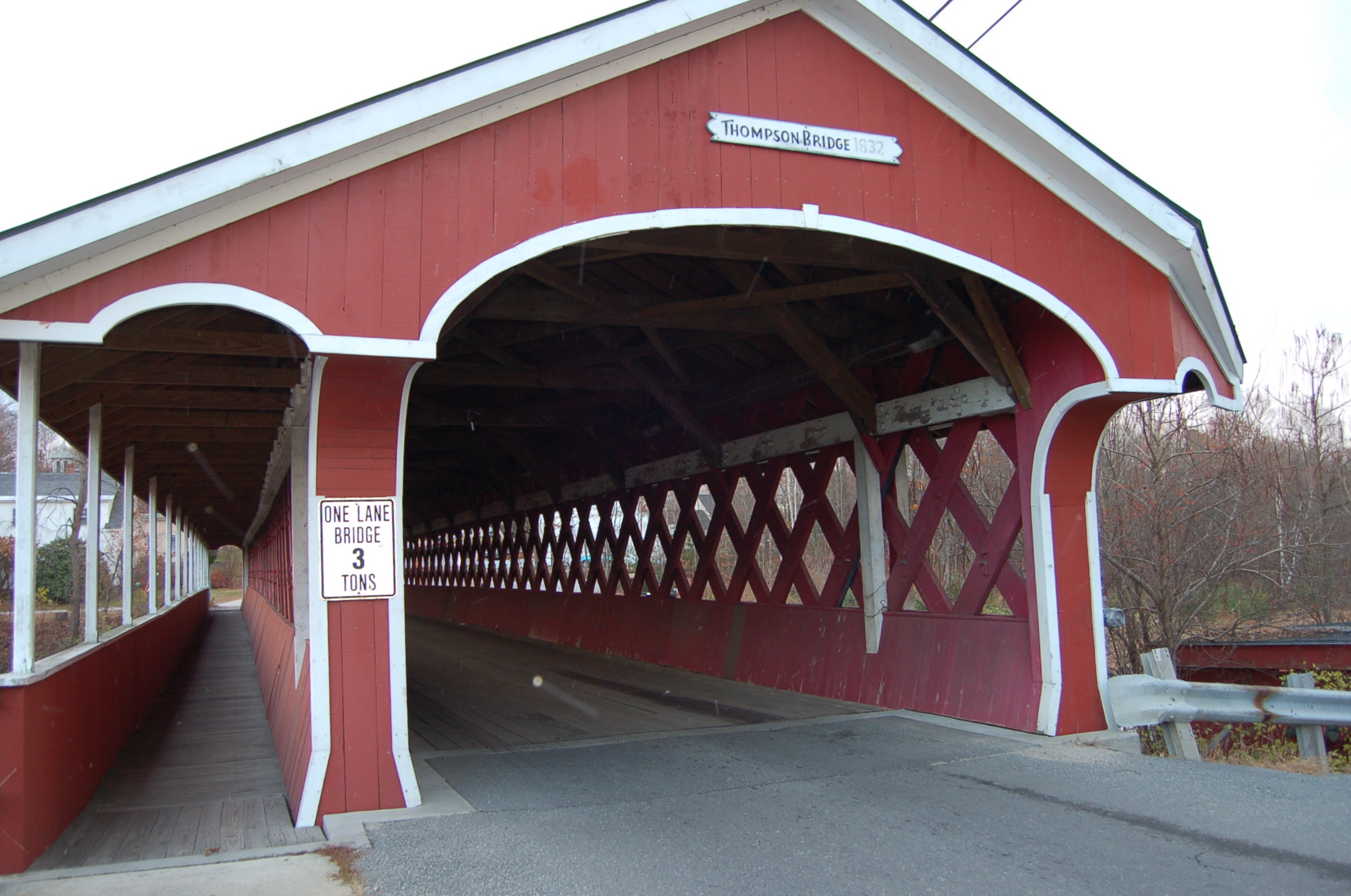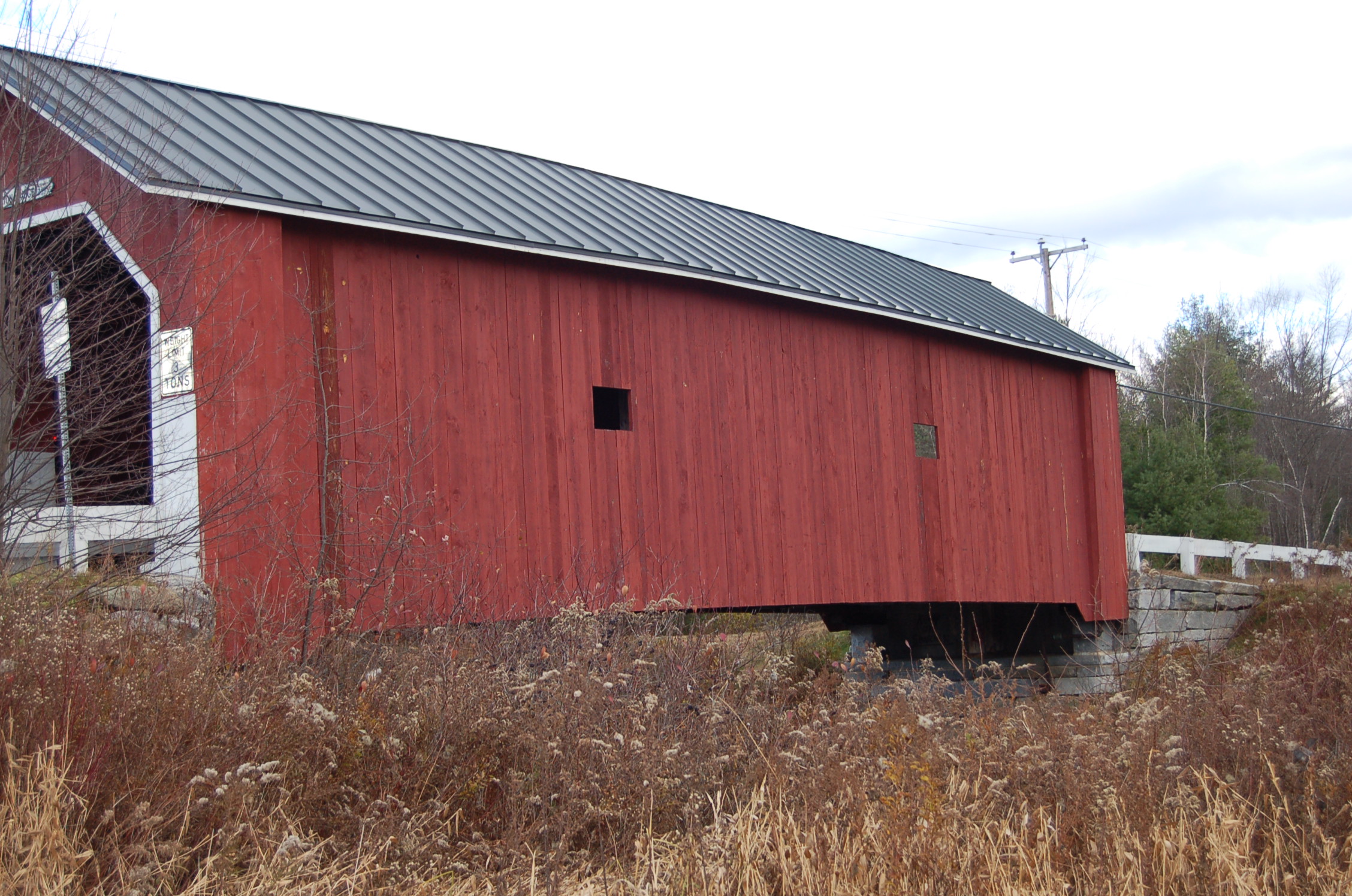 It took some doing to get ourselves psyched up for the first stop. I had visited the Cresson/Sawyer’s Crossing and the Carleton covered bridges earlier this year and wrote about it here. That first trip the weather was lovely and warm, I floated beneath the bridge in my kayak and looked up in wonder at its woodwork. This visit the drizzle was cold, the wind insistent and the Ashuelot River low and muddy. Even these conditions couldn’t take away from the marvel of the construction. These first two bridges are very similar, so much so, I was confused when I went through my photos initially and couldn’t tell them apart. The Cresson has many small windows where as the Carleton has just two on the north side.