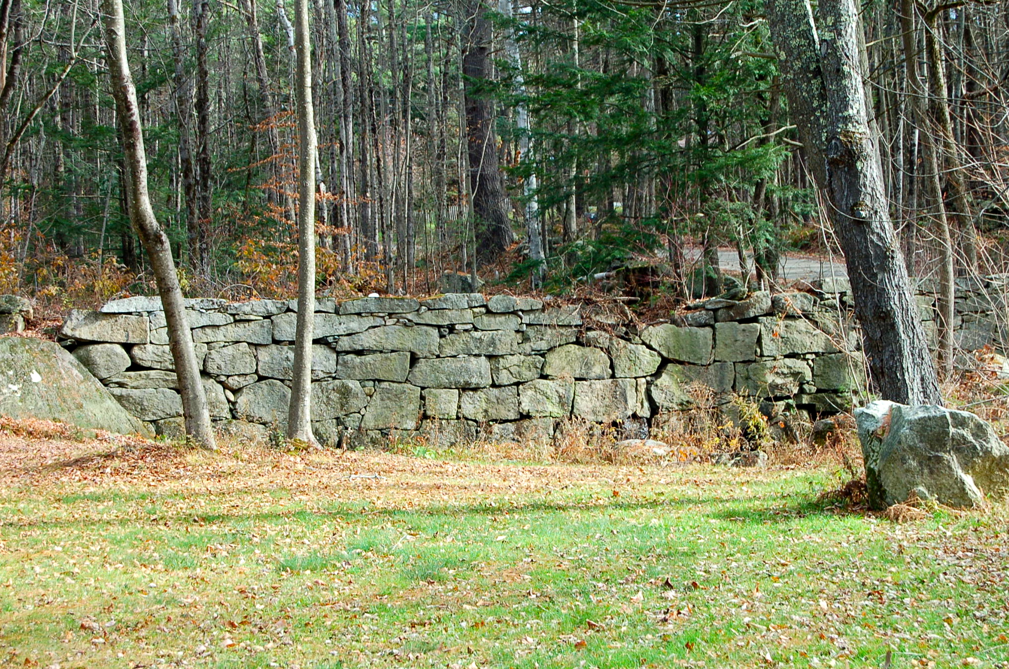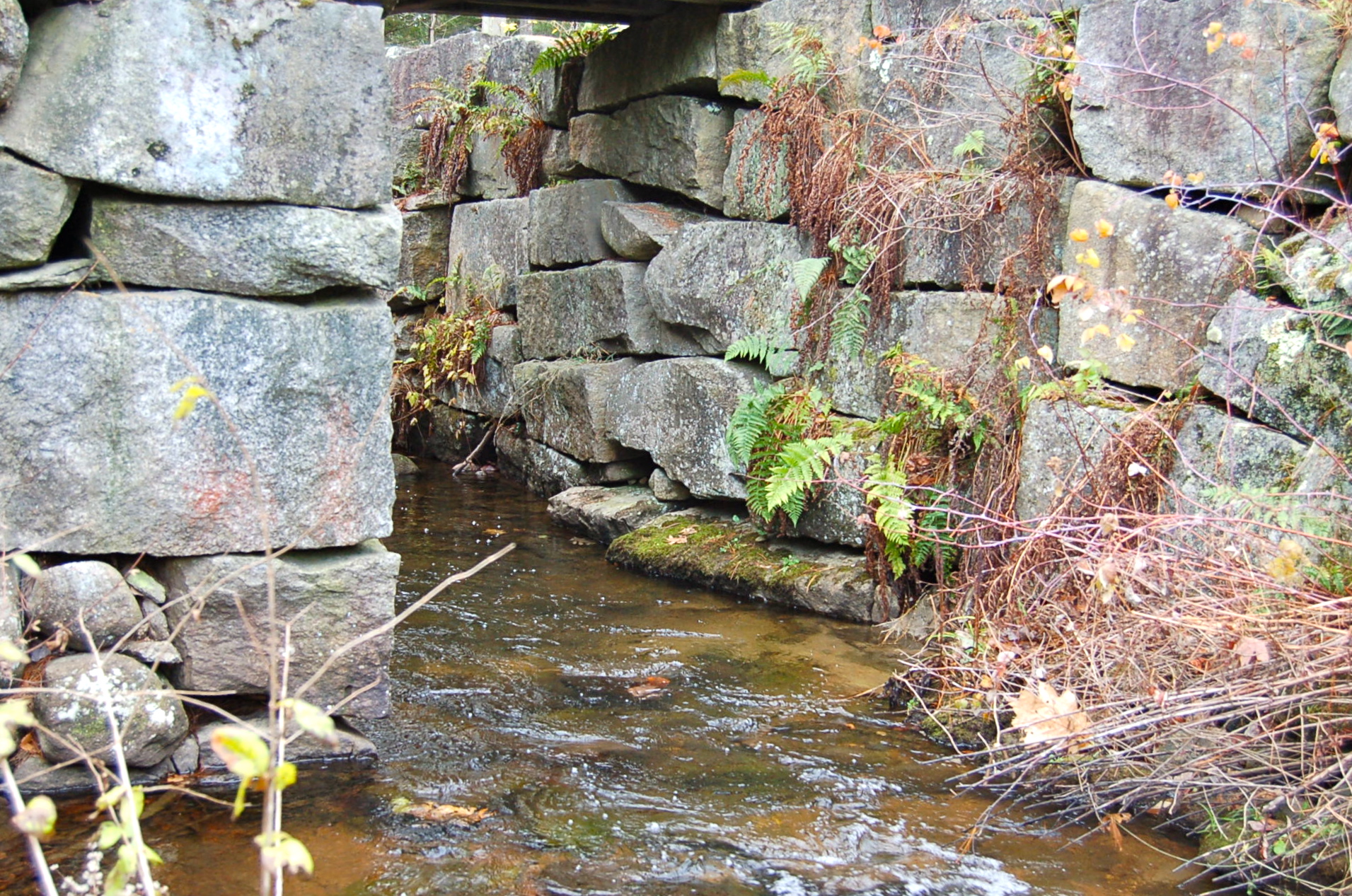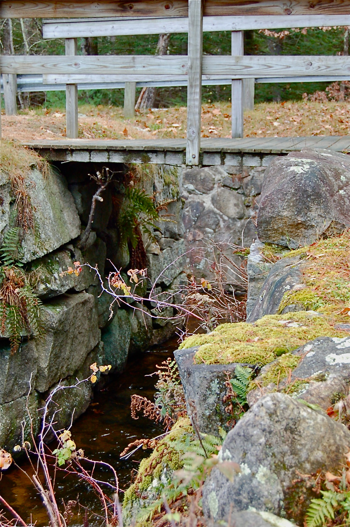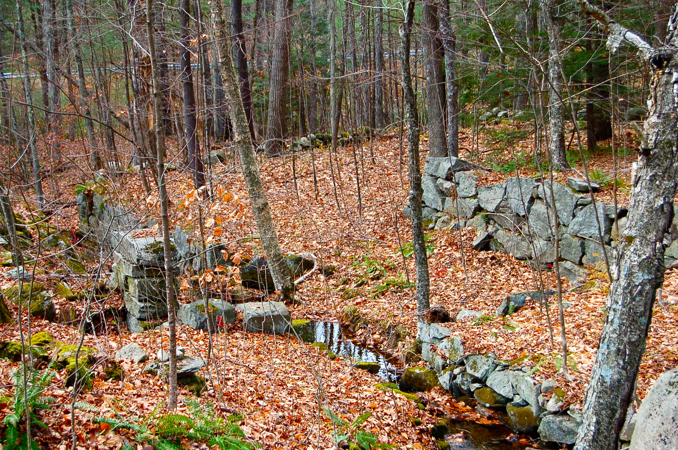 The rain held off long enough for us to journey off the path and discover the remains of a mill. What caught my eye first was the stone work that proved to be the retaining wall for a dam to control what was now just a stream. Across the road, the stream wove its way through glacial boulders to the ruins of the mill. Even though it is November, the ferns are still green and mosses lend a subtle carpet of life to the woods.