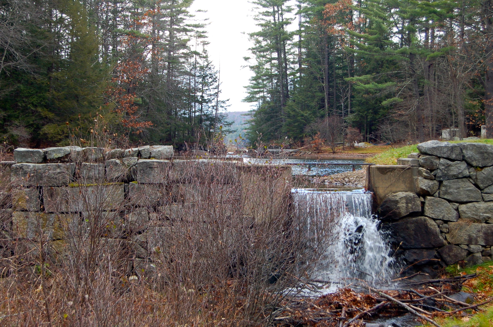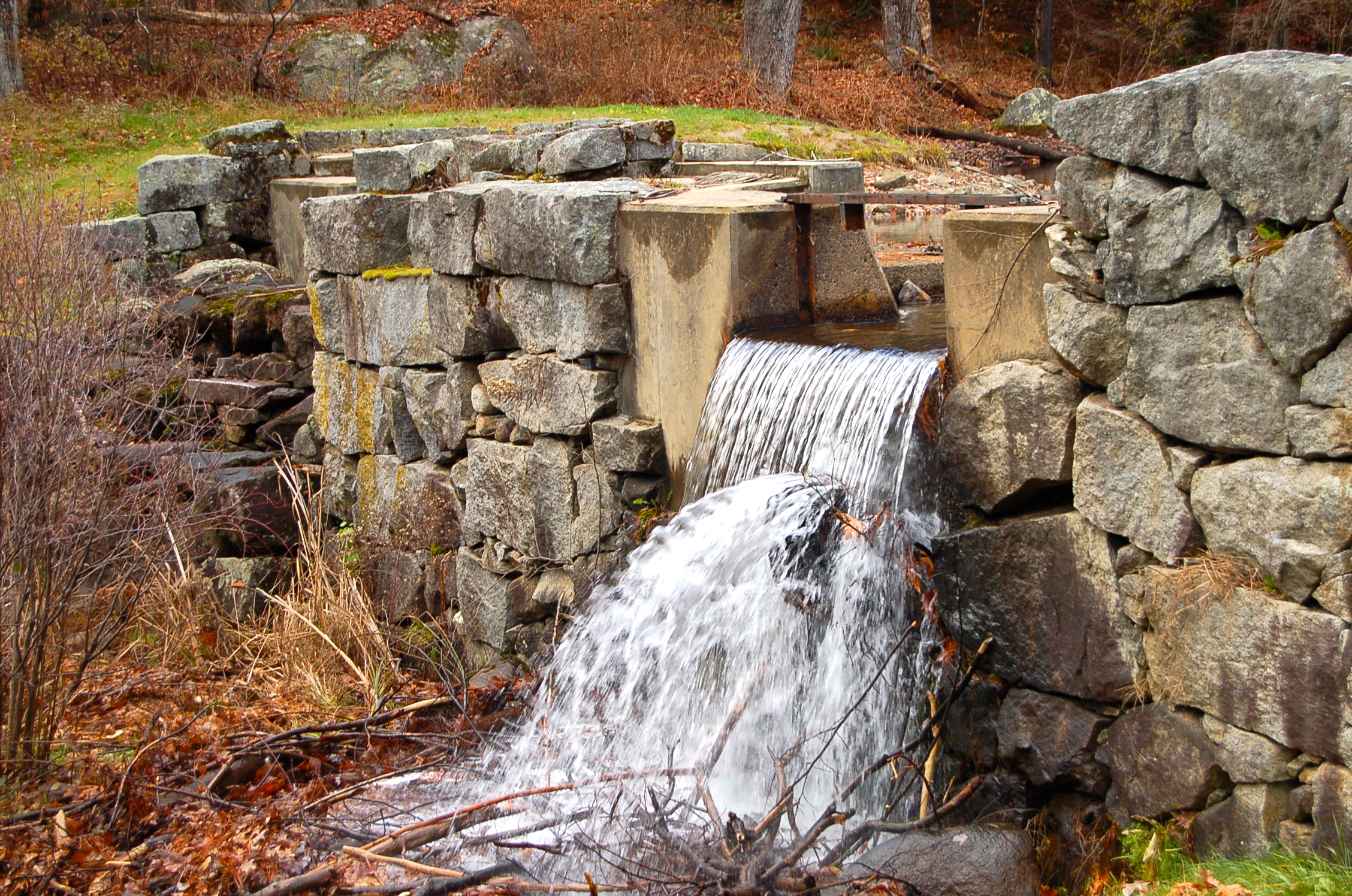 At the mouth of Lake Swanzey, a good-sized pond really, we came upon more stone work and another dam.