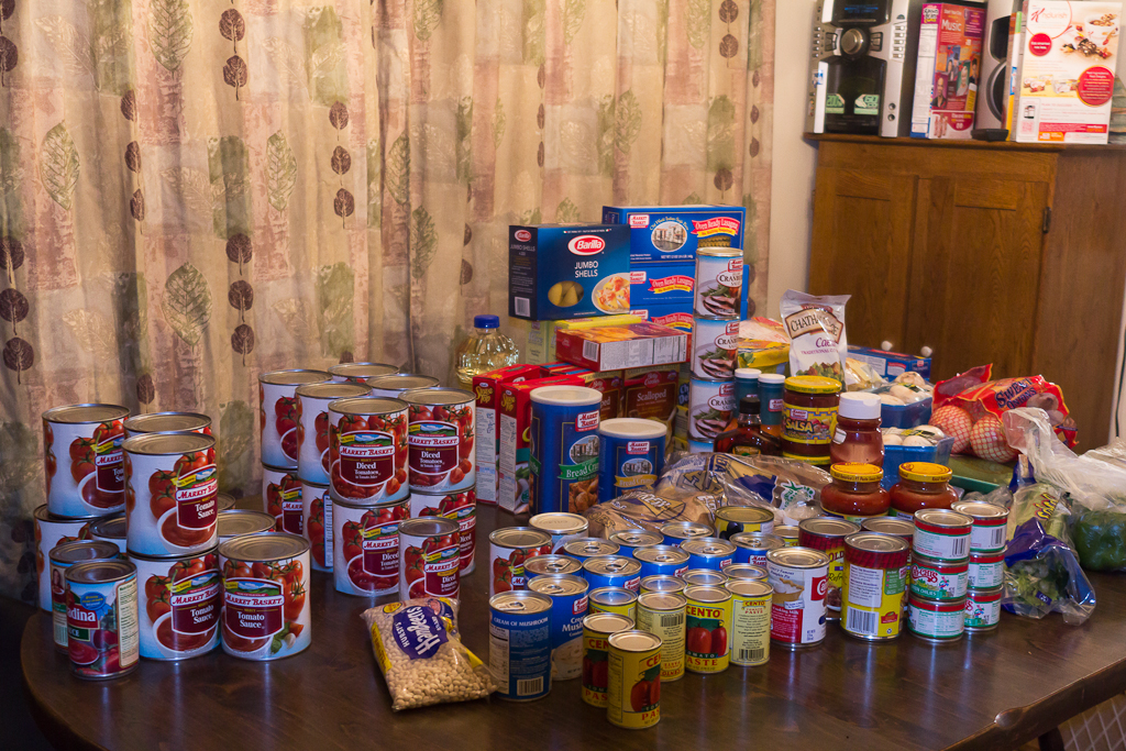 Making the grocery list is an organizational feat in itself. Everything is listed by food group; dairy, meat, veg, canned food, pasta and “other stuff.” The list is built from the fourteen recipes she has selected. Three grocery carts heavier, and $871.23 lighter, she lays out her menus and starts the prep work. The slicing and chopping begins on seven pounds of onions, three pounds of carrots, eight zucchini, five packages of fresh mushroom, four bundles of green onion, and three green peppers. Ten pounds of potatoes are baked, stuffed and frozen.