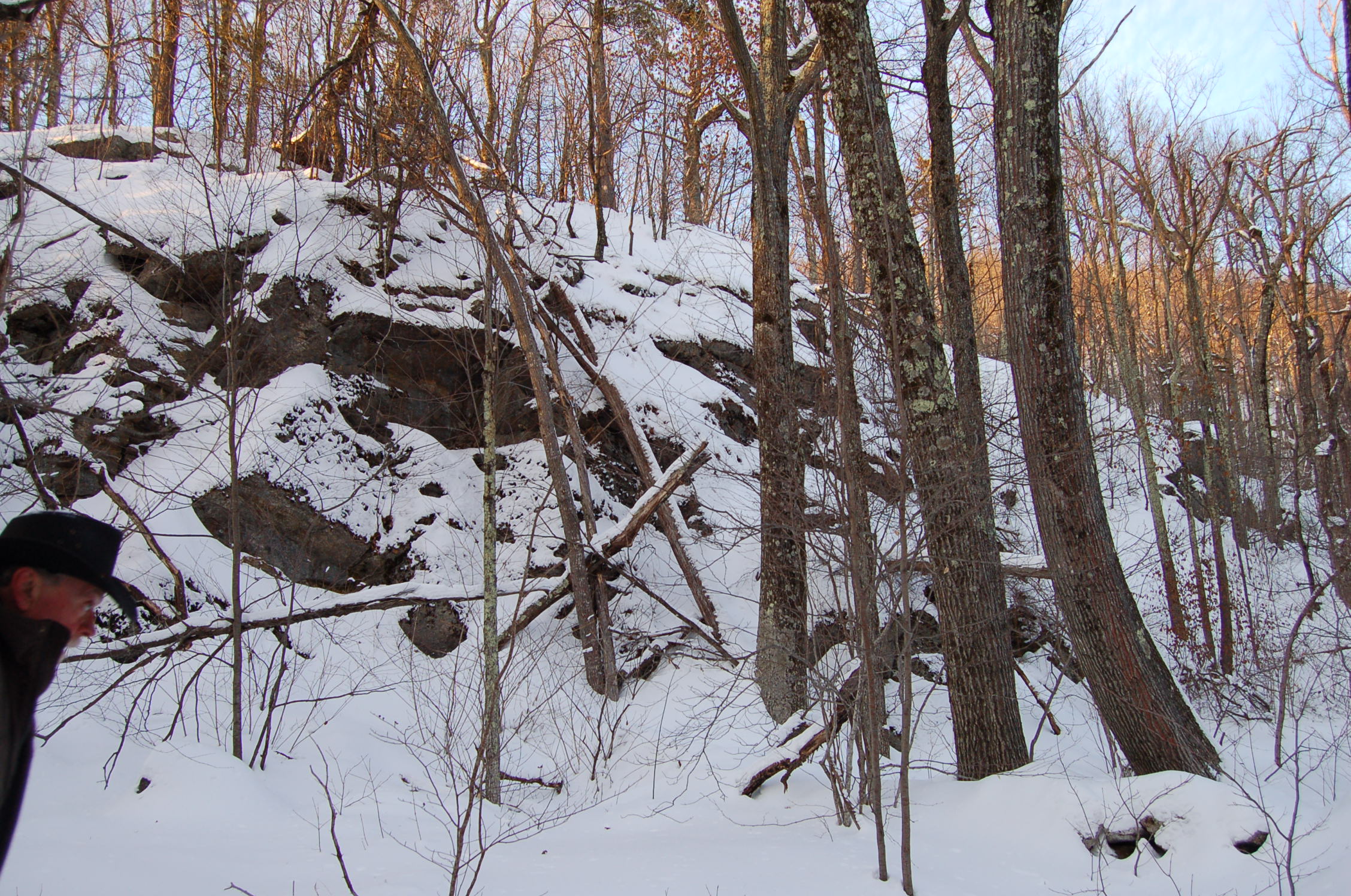 Silence was only broken by the raven, whose roost we disturbed as we trekked to the base of the ledges. It is difficult to honestly portray the scope and height of the ledges. Wilson stepped into my shot, conveniently adding scale. Alice found deer tracks and was off, distracted by an ancient scent that obliterated my calls.