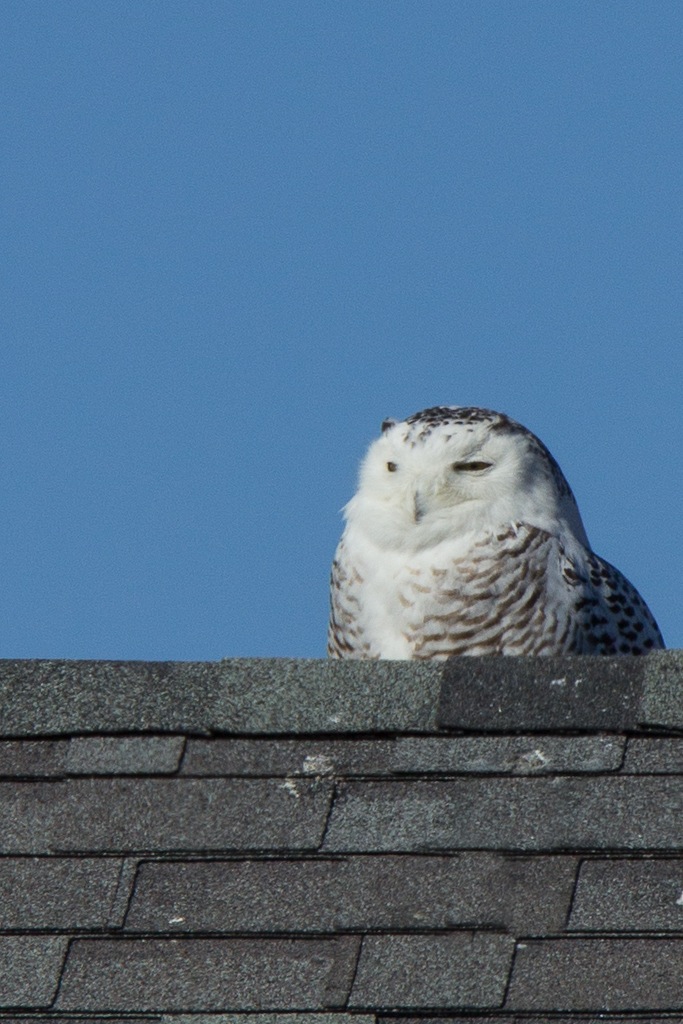 We did see one snowy owl. She sat atop a house between the marsh and the harbor, keeping an eye on both for snacks. One birder we spoke with said she had been very active the last few days, catching a duck at one point and feeding on small voles in the marsh. Today she seemed content to gaze down at us with disdain.