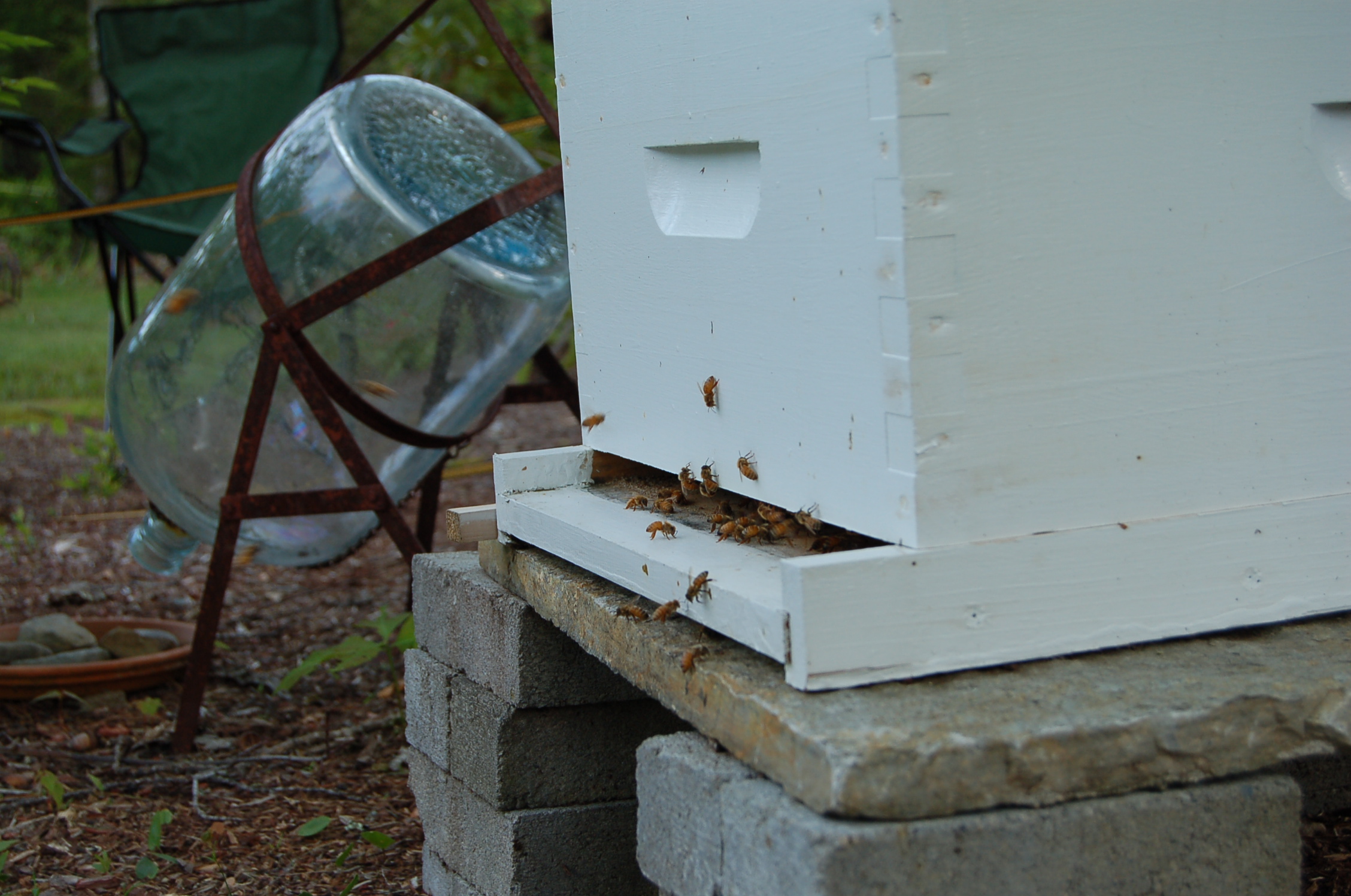 Tonight at dusk I went out again to place the five frame super on top of the small hive. These bees came from here, but have been on their own for two weeks with no human interaction. They were clustered on the “stoop” fanning the hive and kibitzing like a cluster of old italian women on wash day. I was dressed from the shop, loose linen slacks, sandals and a white cotton T-shirt. I may have been fool-hardy. No protection. The smoker fired up on a full tank of pine cones and calmed the ladies. I slowly and deliberately took the top off, removed the inner cover and placed their new box on the hive. Several buzzed about my face; I slowly drew breath through my nose and exhaled to the side, so as not to insult them. The world calmed and a few landed and tickled my bare arms. When they were bungied back together on the stump, I puffed the smoker around myself to deter any hitchhikers and slowly left them to decorate the new wing of their castle.