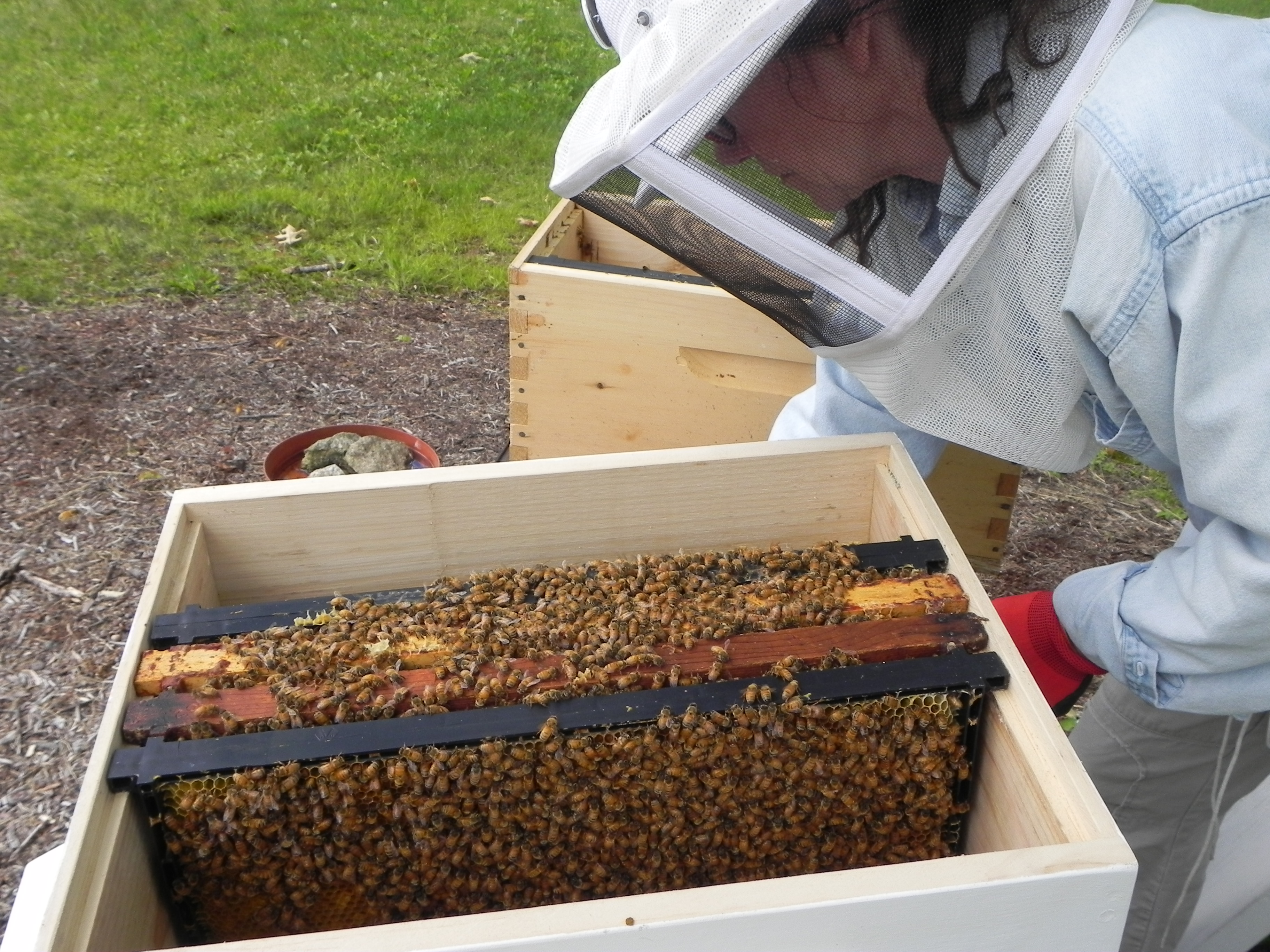 I never did see her but with all the disruption I suspect she was hidden. I did see lots of evidence of her in new brood and larva. I only wear the hat and veil because I don’t want them to become trapped in my hair or accidentally sting my face. They generally are very docile.