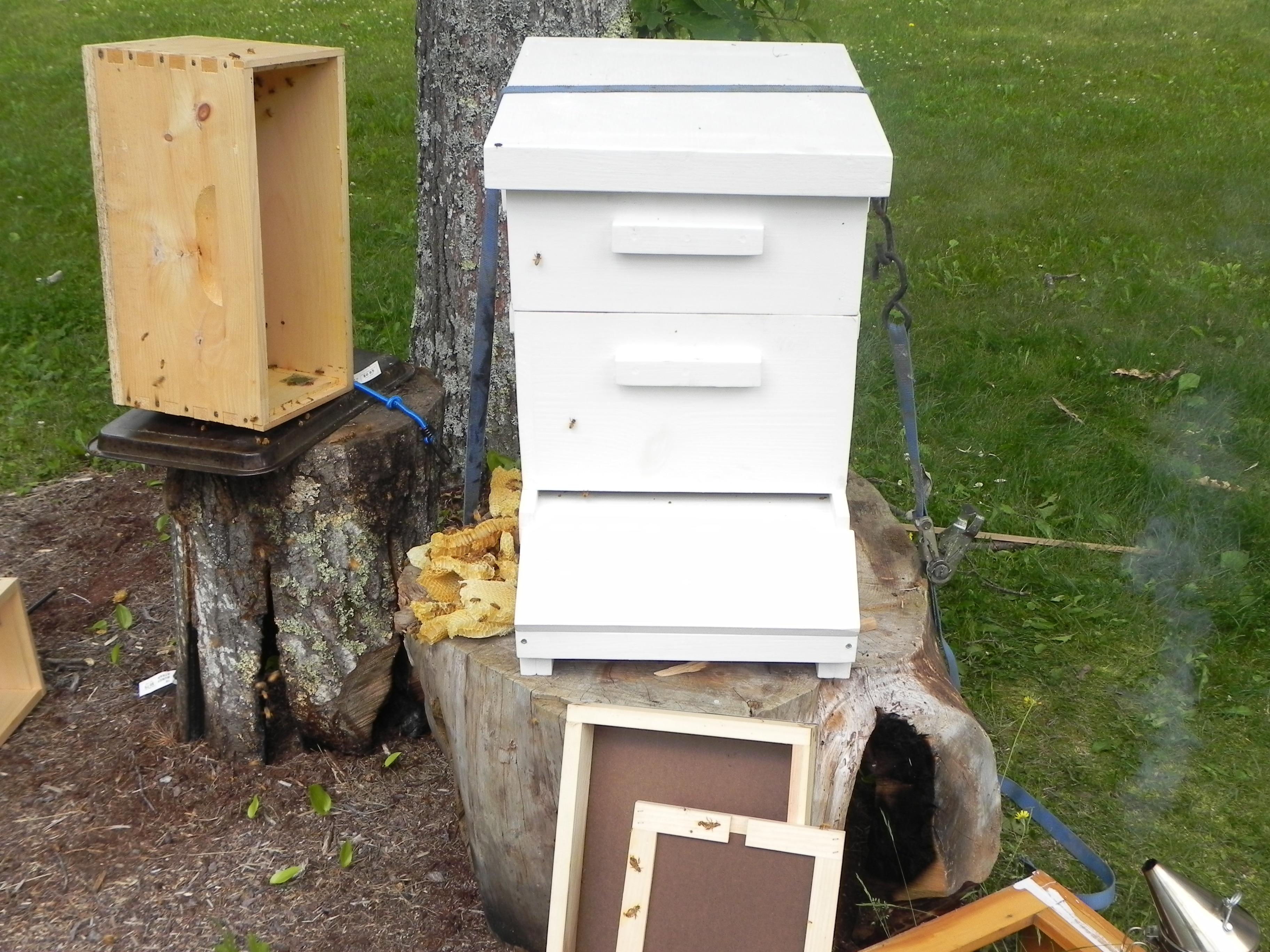 Note the pile of discarded honey comb on the left of the new hive. Such a waste of their efforts but nothing to be done about it.