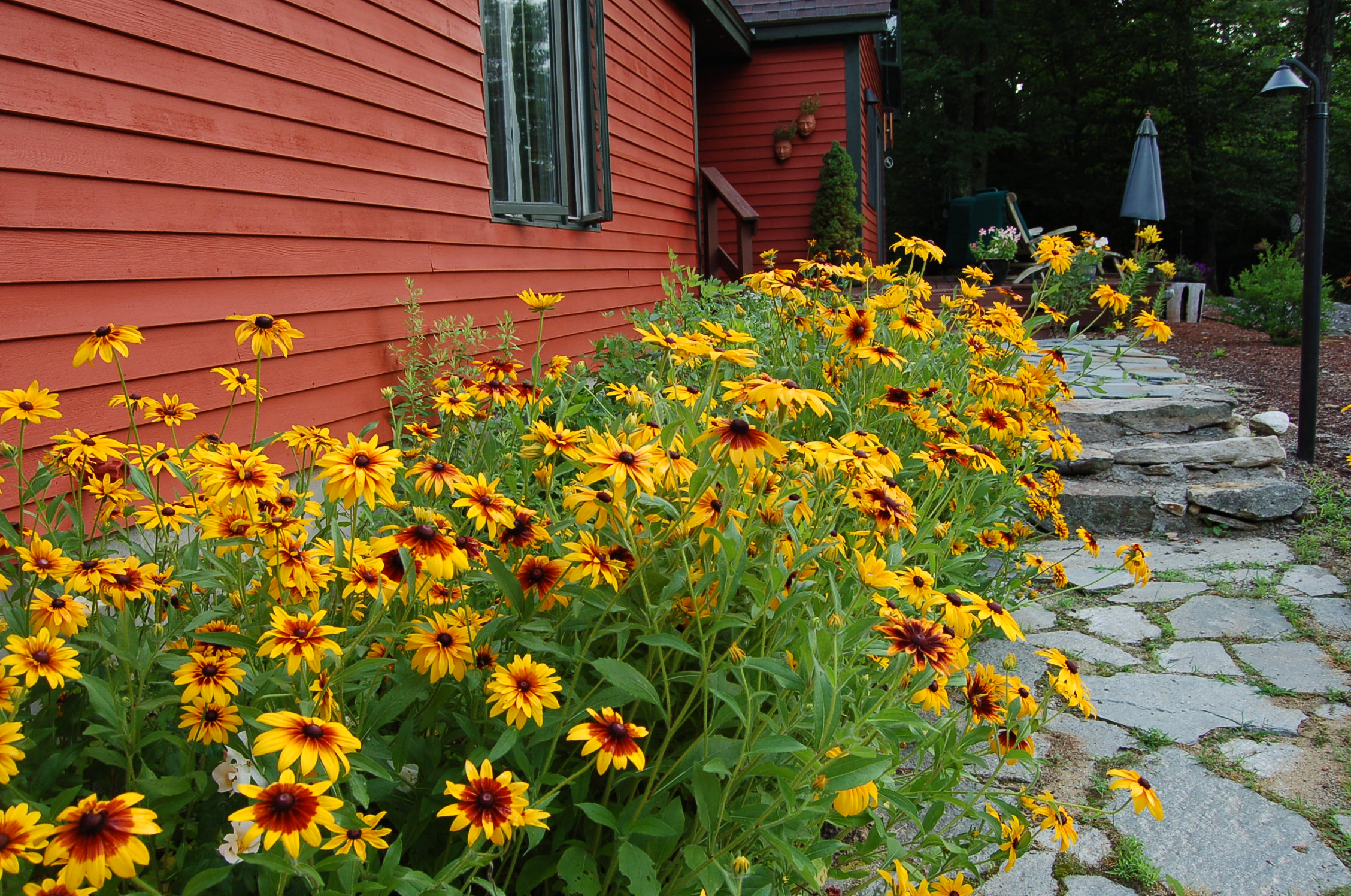 I think these are Rudbeckia hirta. They have taken over the garden, the walkway and are progressing into the yard. I’m such a lazy gardener, I see them as a “feature” and not an annoyance.