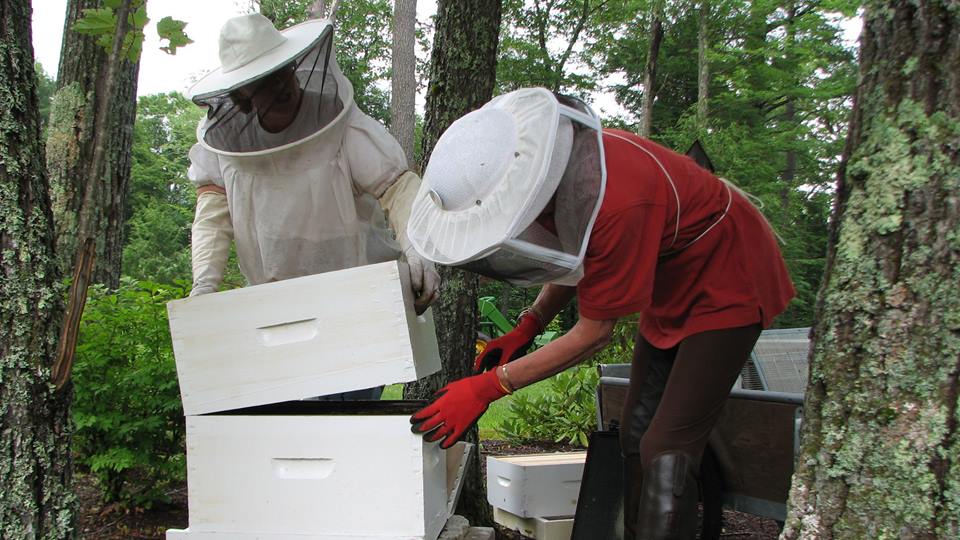 Though I didn’t get any photos of the neighbor’s hive, I felt strong and wise after the weekend visit to my hives with my mentors, Jodi and Dean from Imagine That Honey. Dean was chief photographer and Jodi guided me through a total, “take-everything-apart-and-reconstruct-it” hive inspection. They were early and I was just coming back from errands and riding. For once, I was 99% covered in tall boots and a sensible polo shirt.