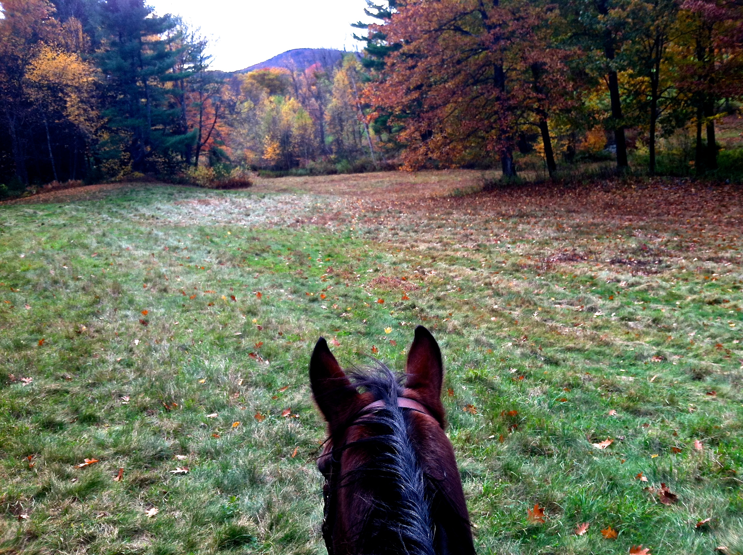 Heart-pounding gallop down the dirt road. Not that there was any point of feeling out of control, just the knowledge that one misstep would be painful. Cutting through the old paths back to the main road, leaves carpet in yellow and red, flying up behind us on the hills as we run. The ground below is slickly muddy from recent rain, corners should be respected, we slow to a fast “marching” walk. Gaps in the stone wall must be jumped, you never know what rock might just tumble and catch a foot, though they haven’t moved in over a hundred years.