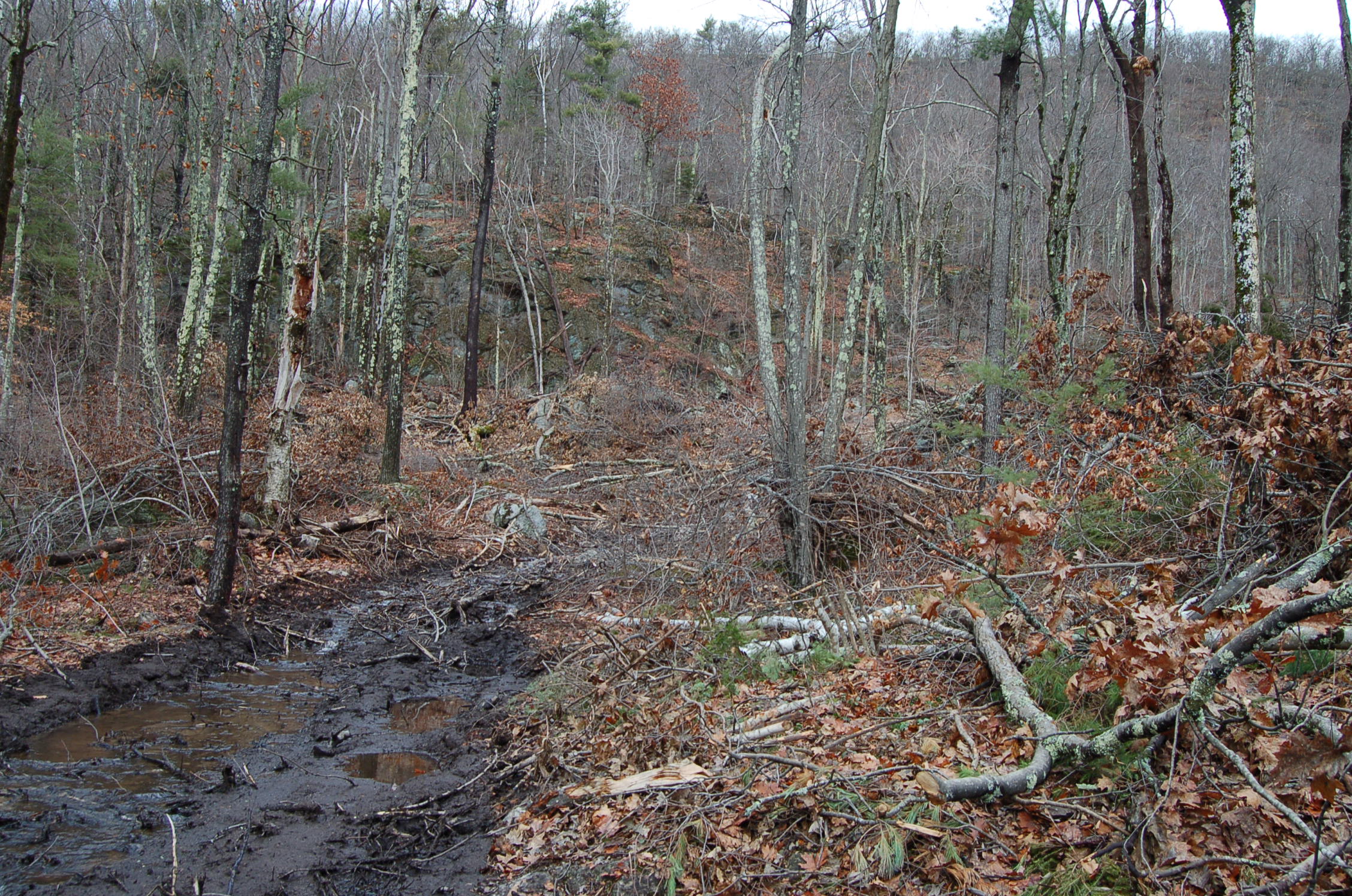 In contrast, earlier today I dragged Alice out back to look at the logging project. We haven’t been up there weeks. The Christmas thaw has sent a deep warmth into the earth and torrents of water are rushing down from the ledges. Our usual route was detoured though I could see clearly where we wanted to go.