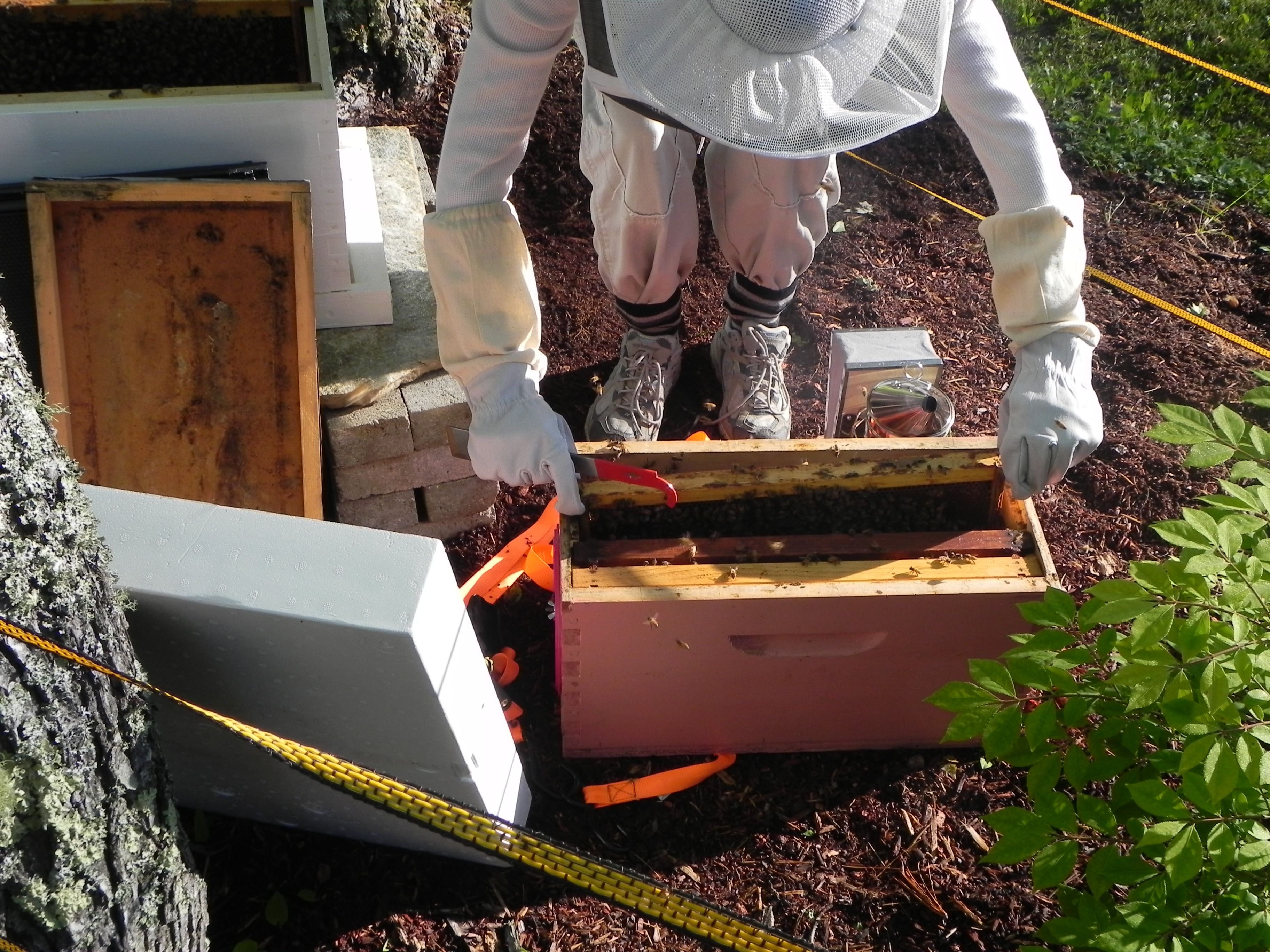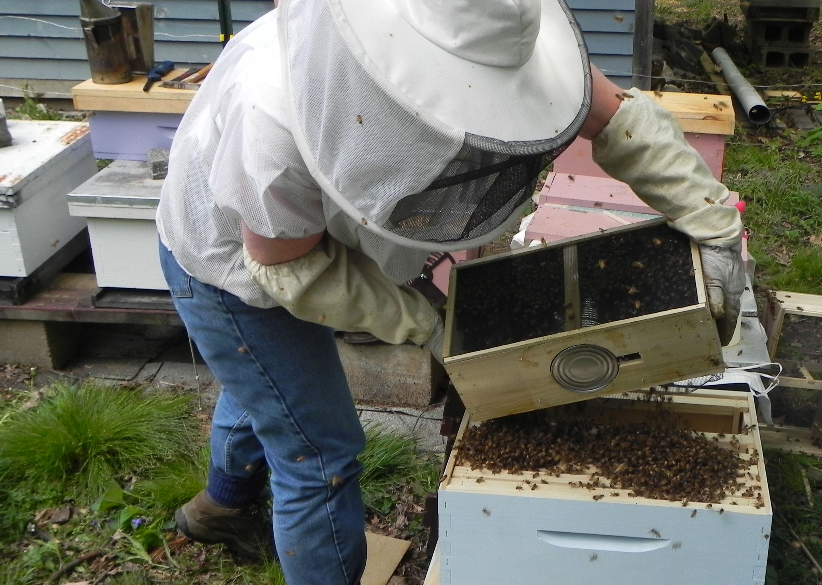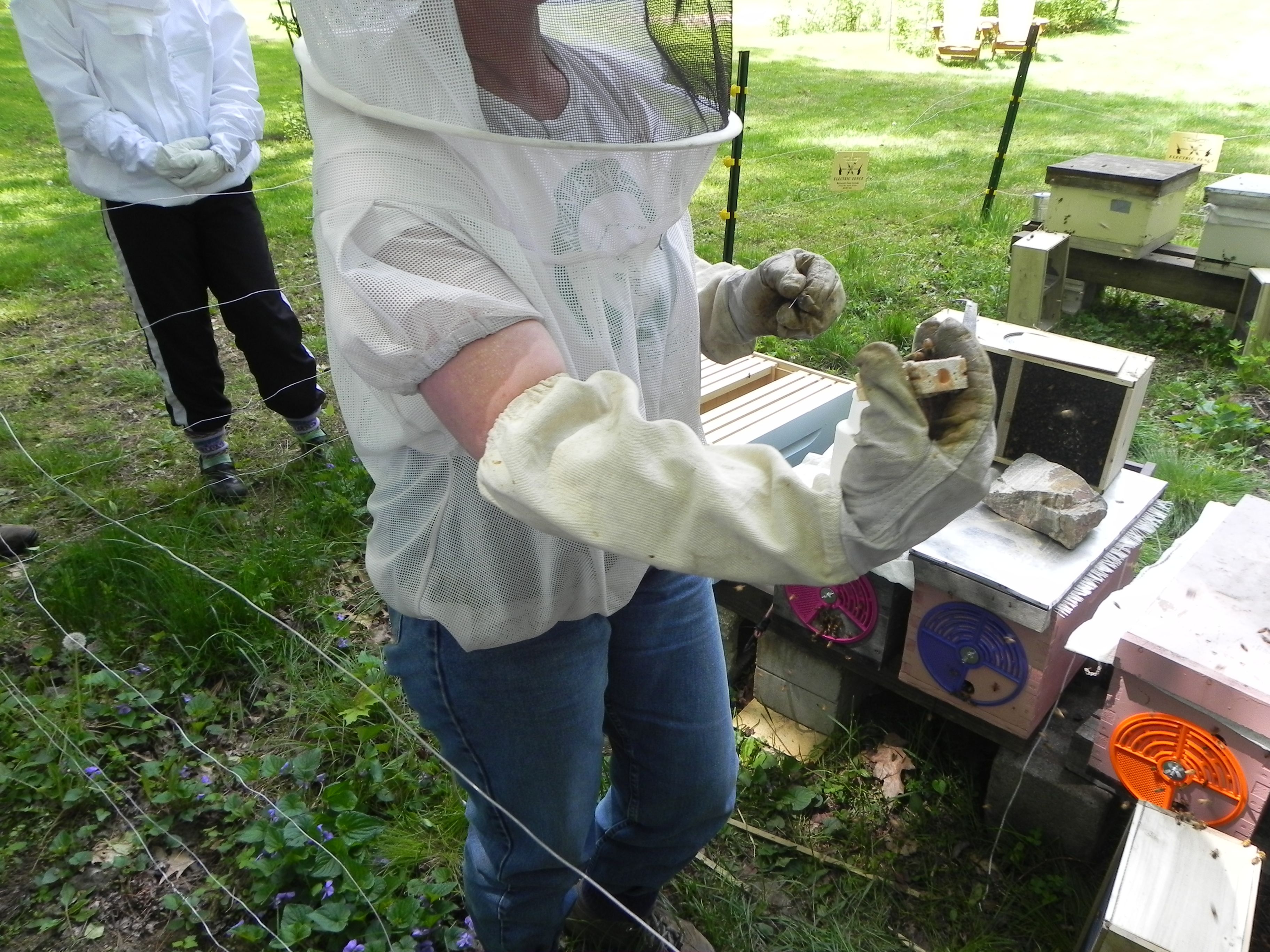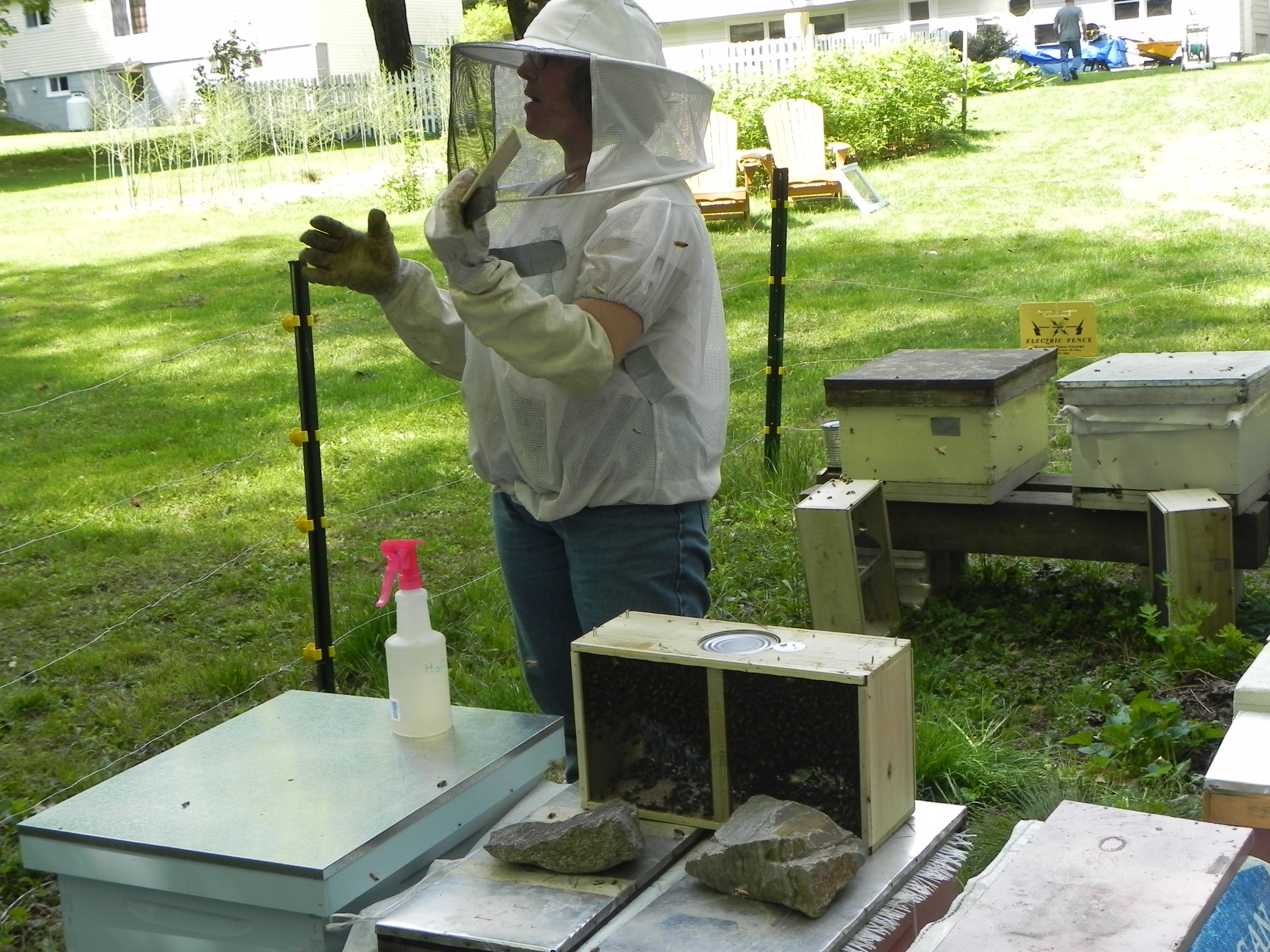 Packages are a newly mated and marked queen with a bunch of bees she hasn’t met yet. The queen arrives in a cage with a plug. They are cheaper and available earlier in the year so you can start quicker. The bees are literally dumped into an existing hive and the queen stays in her cage. The plug is replaced with a sugar plug which the bees eat through to free the queen, thereby claiming her as their own.