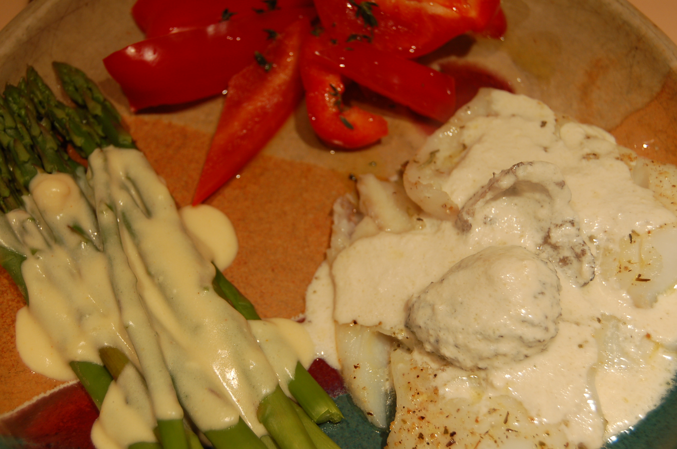 From the cookbook I took the recipe for Sea Bass and worked with what I had. The cod was sautéed in Wild Mushroom & Sage infused olive oil as I whisked the sauce in a double boiler. I couldn’t replicate it exactly, I had no fresh chives (under leaves at the moment) and no shallots. But the fresh, pine cone shaped Morels were spongy tender and pungent. I added fresh asparagus for a spring-green touch then drizzled it with hollandaise sauce, obliterating any nutritional value. Crunchy red pepper slices with a dusting of fresh thyme and a slick of Tuscan Herb infused olive oil redeemed the plate as “healthy.”