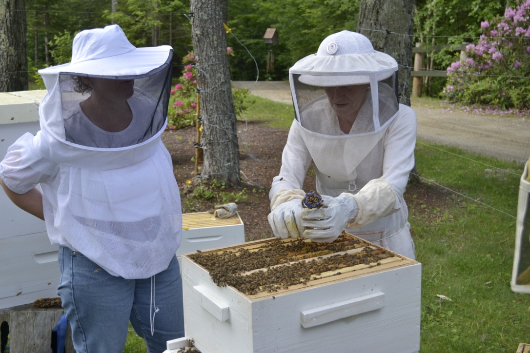 Cleo’s hive is massive. She and her colony are also larger, darker bees. I love my little gold bees and their calm personalities. These I was not yet comfortable with. Sure enough, one flew out and stung Jodi with a direct hit. We all took a deep breath and moved more slowly. Calm and sincere movements were called for.  It also is on a larger stump and therefore harder for me to reach and see inside. Time for a stepladder when next I inspect.