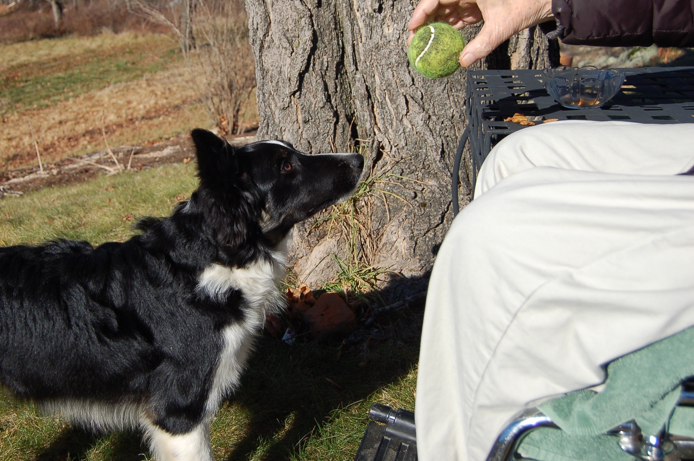 I had brought him a treat of Chex Mix. The cereal, nuts and pretzels are easy for him to eat by hand and I love watching him pick through it for preferred morsels. As I set the bowl on a table next to him, the farm dog appeared with her tennis ball.