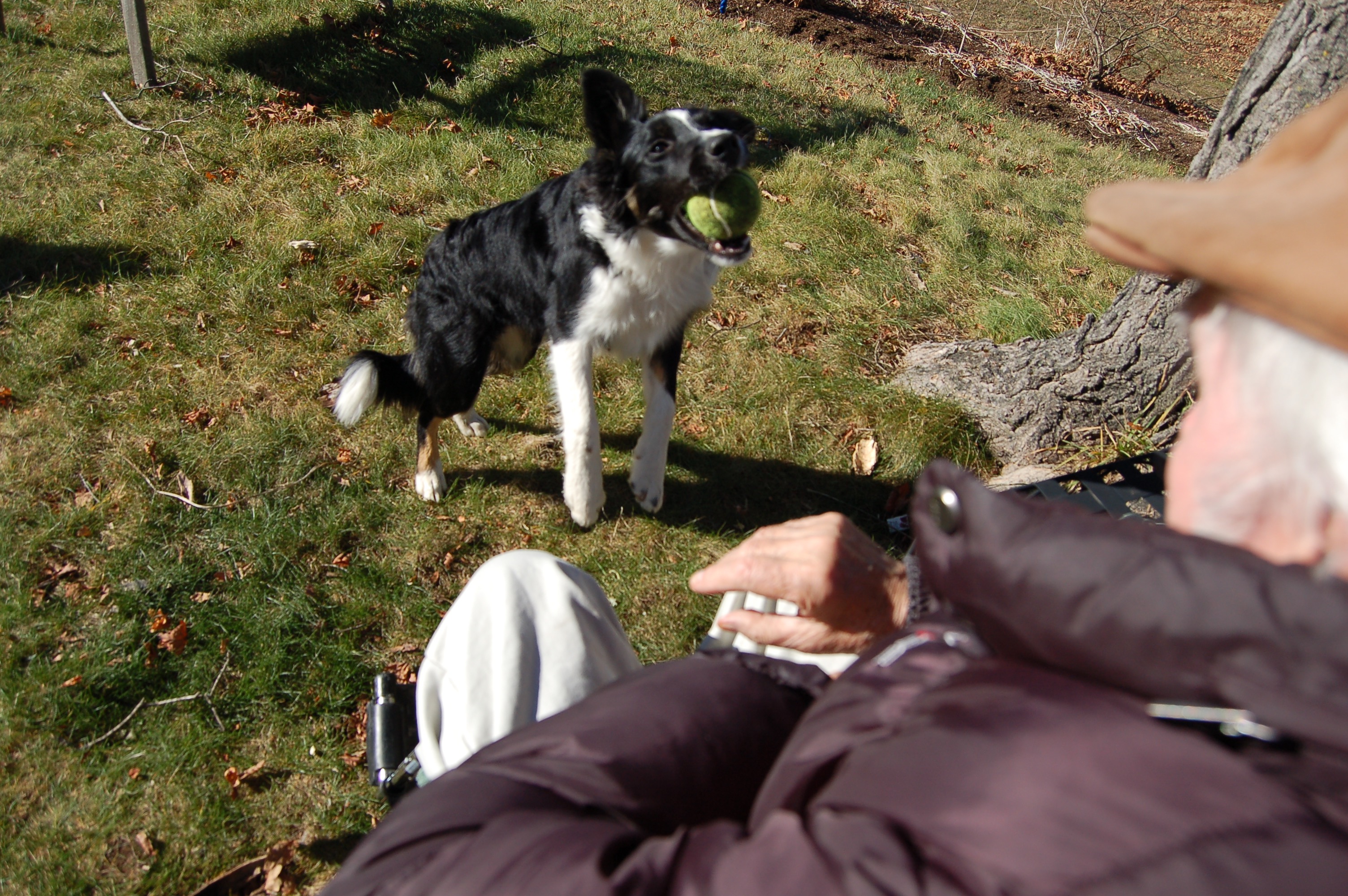 The gentleman sat down and started chattering away. “So how are you doing? What are your thoughts?” No answer from my friend. The dog turned her attention to the newcomer, hoping for more games of toss and retrieve.