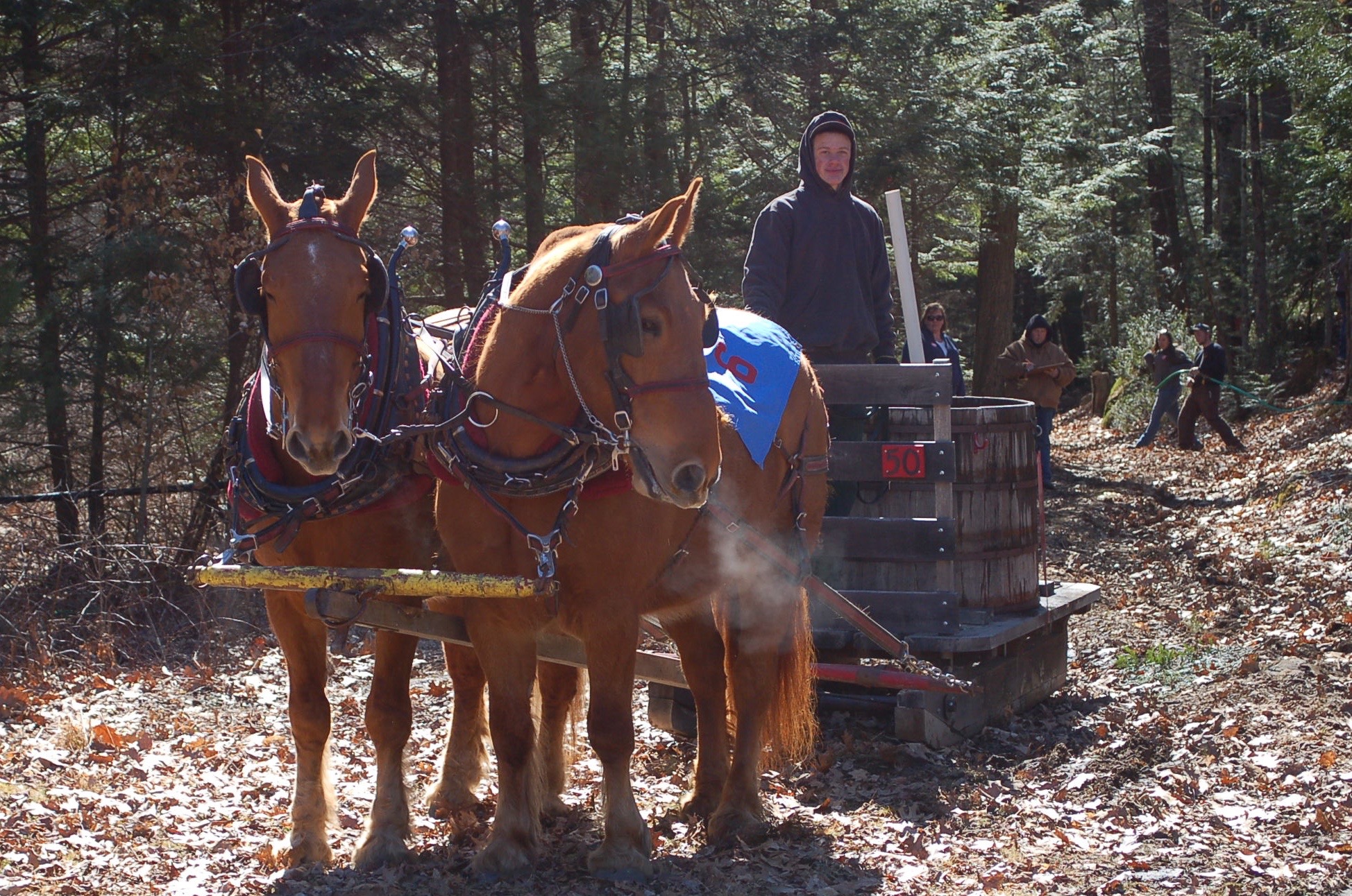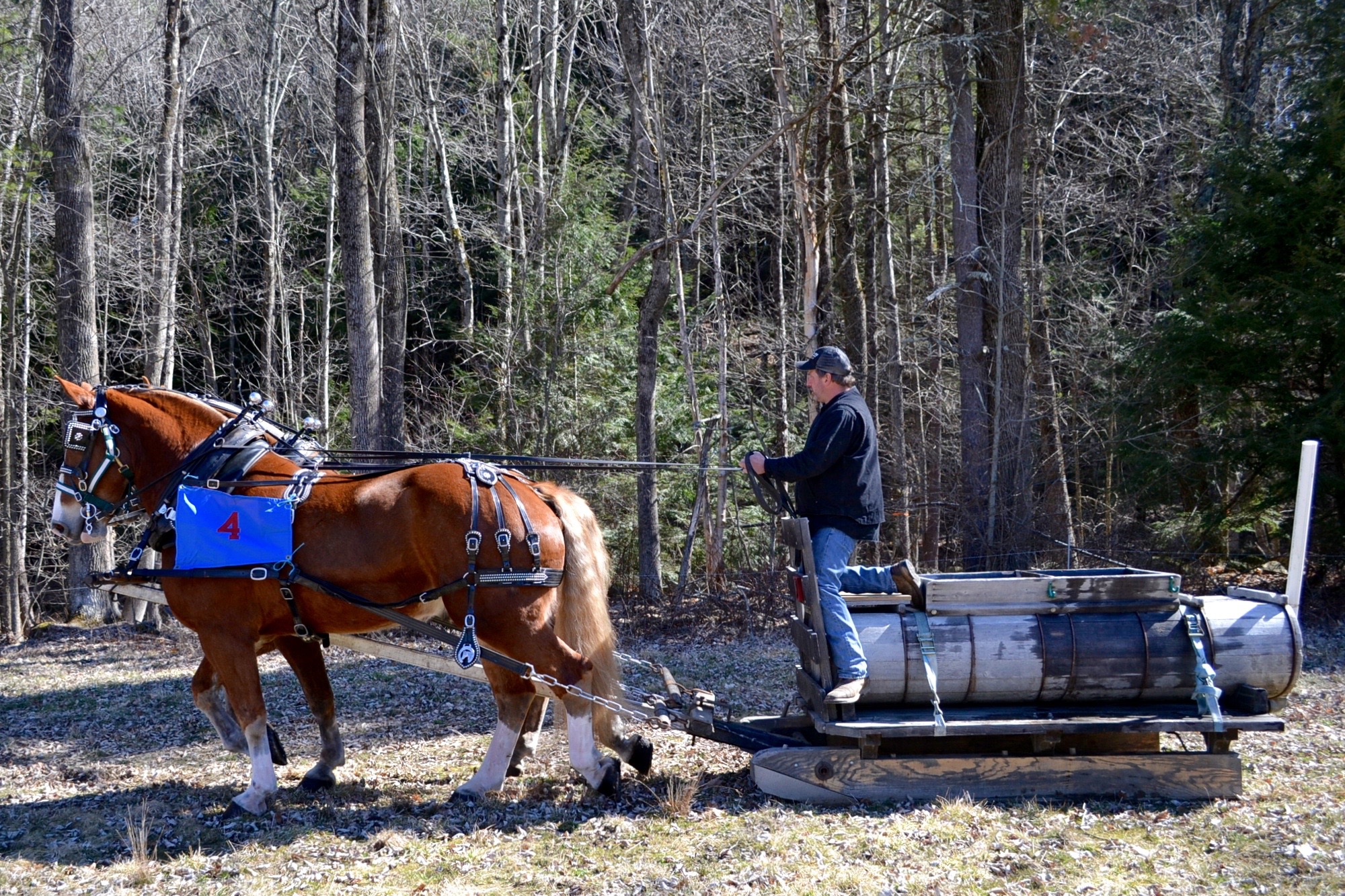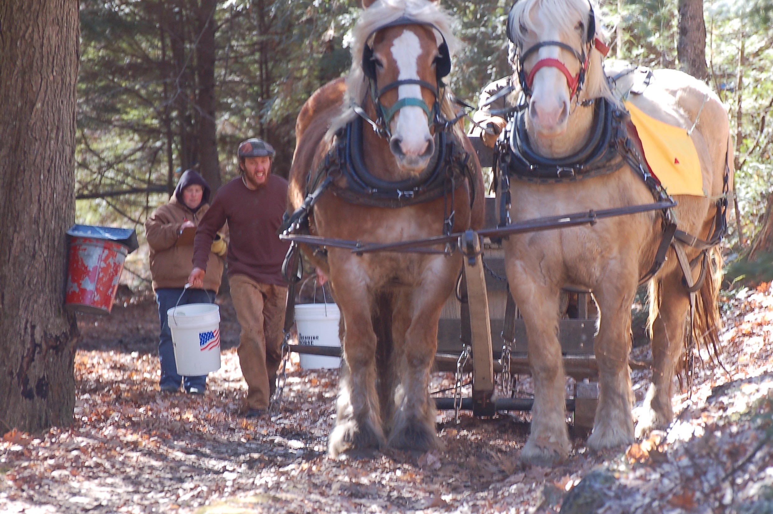Saturday was the 17th Annual Sap Gathering Contest at Stonewall Farm. According to their website, “This event highlights not only the state’s important maple syrup industry, but also celebrates New Hampshire’s rich farm heritage.” Seventeen teams of draft horses,  teamsters, and “sap runners” competed. The contest involves hitching the team to a sled with a large tank on the back. The two sap runners must dump 40 buckets of sap into the tank as the teamster guides the sled and horses around a course through the woods and fields. All of the sap buckets and their caps on the course must be emptied and properly installed back on the trees. Speed and amount of sap gathered are tallied for each team; penalties include spilled or missed buckets, and horse/teamster mishaps.