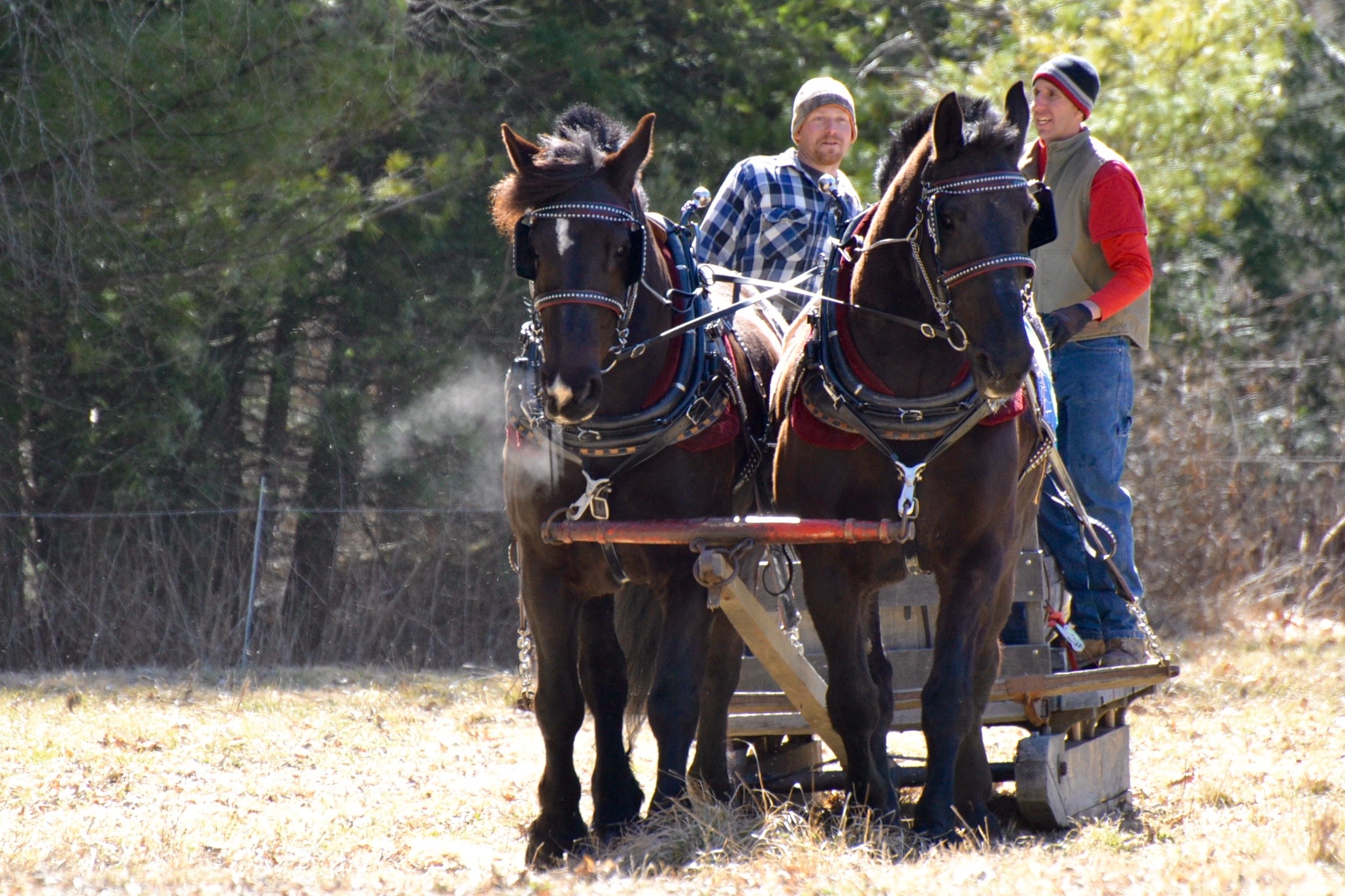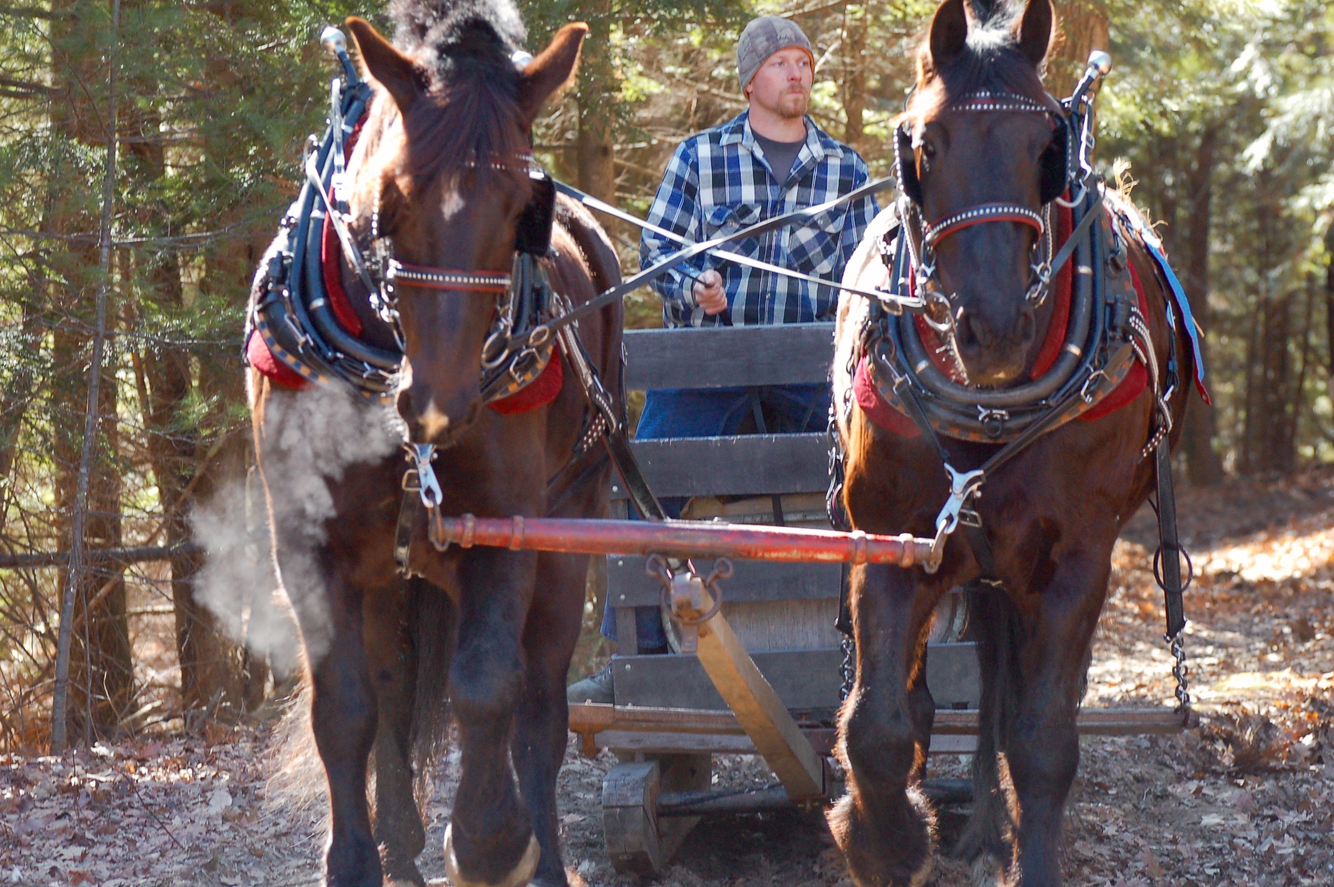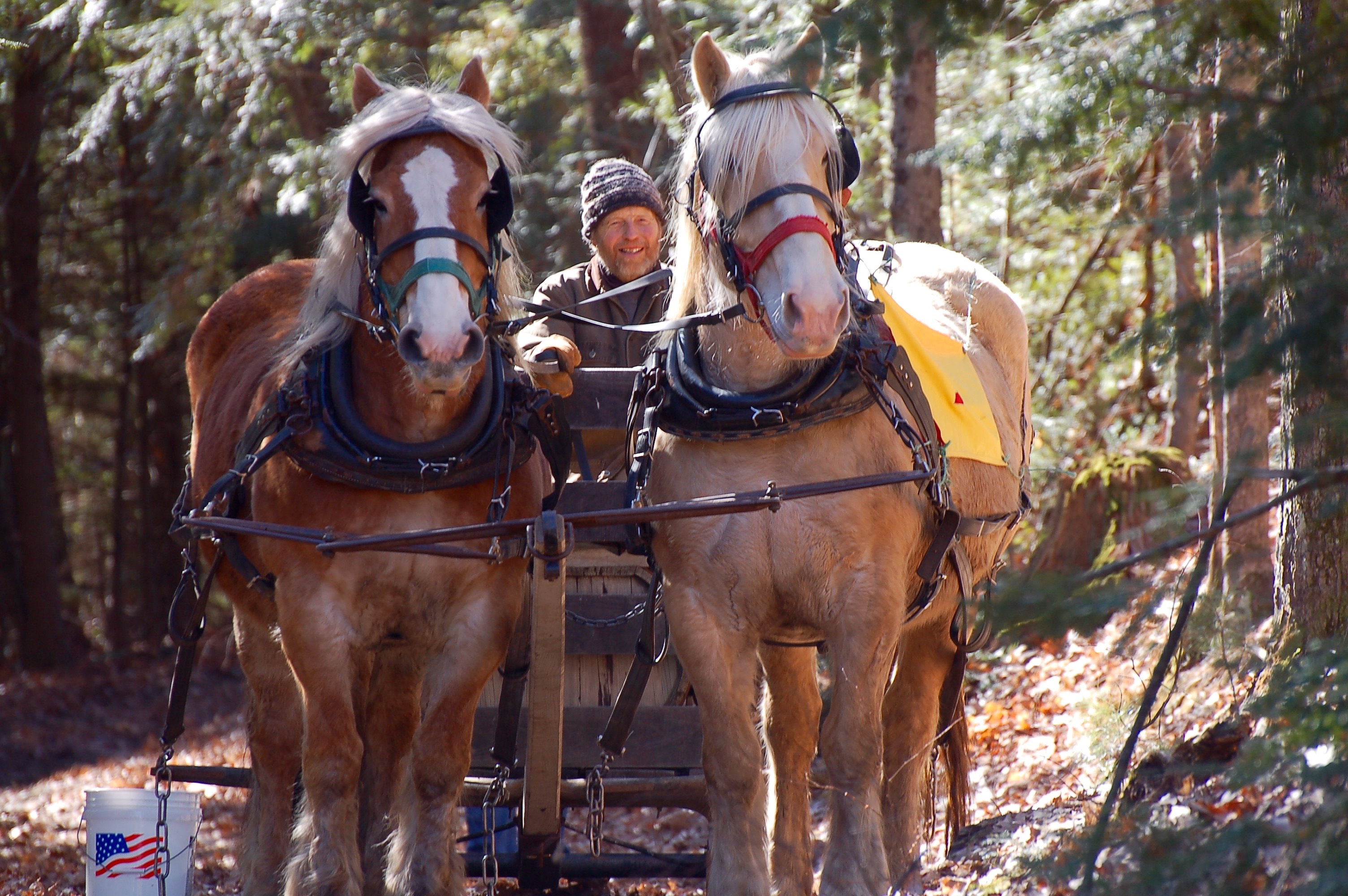 Saturday was the 17th Annual Sap Gathering Contest at Stonewall Farm. According to their website, “This event highlights not only the state’s important maple syrup industry, but also celebrates New Hampshire’s rich farm heritage.” Seventeen teams of draft horses,  teamsters, and “sap runners” competed. The contest involves hitching the team to a sled with a large tank on the back. The two sap runners must dump 40 buckets of sap into the tank as the teamster guides the sled and horses around a course through the woods and fields. All of the sap buckets and their caps on the course must be emptied and properly installed back on the trees. Speed and amount of sap gathered are tallied for each team; penalties include spilled or missed buckets, and horse/teamster mishaps.