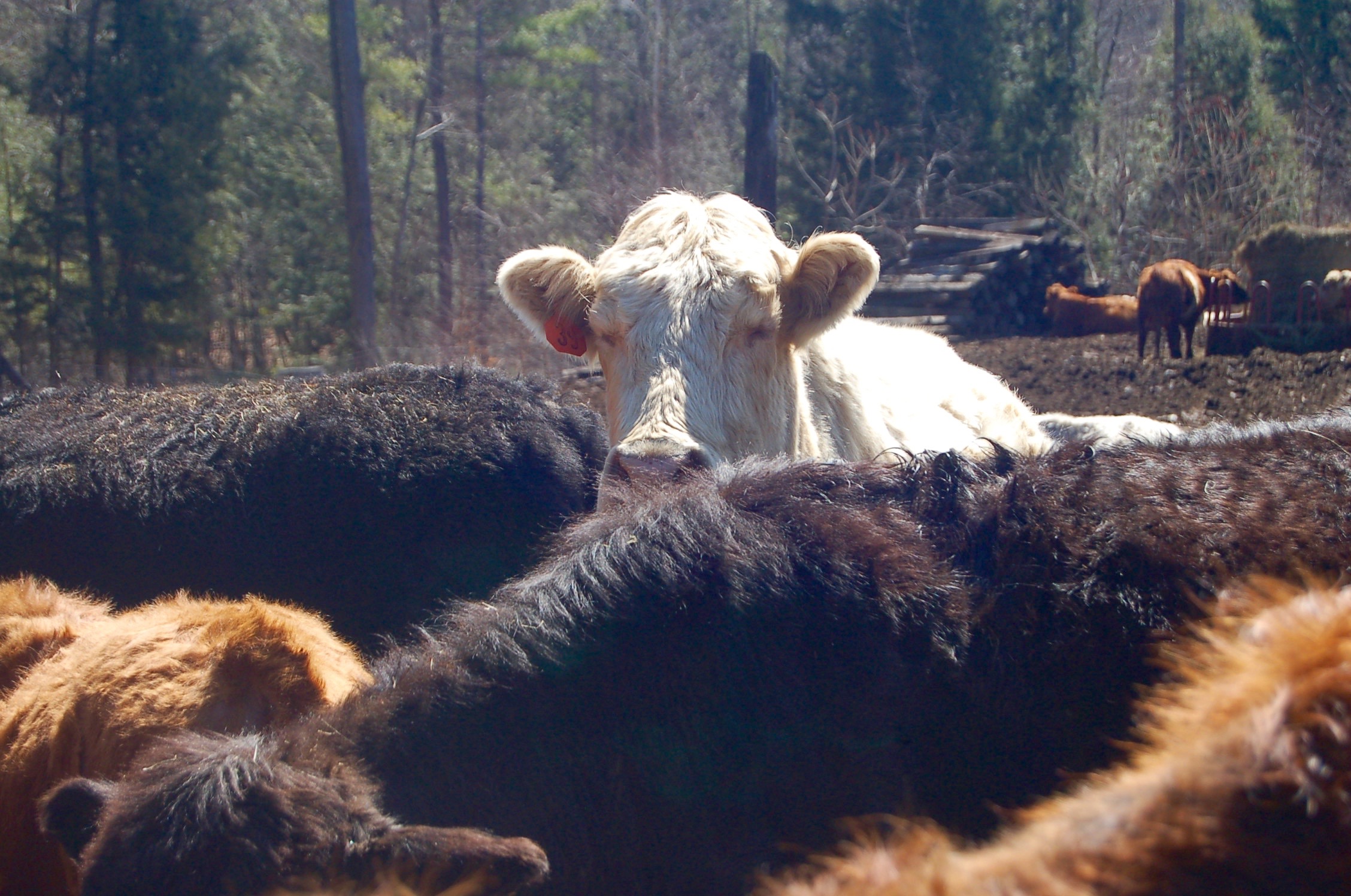 The baby bullock, who is no longer a baby, stood under the shed roof of the red barn. Snow, melting on the metal roof, was running off and his head  twisted round to catch the stream on his tongue. Of course this splashed it  into his large round eyes. A full course of head shaking and massive licking repeated several times before I realized he was playing. There was a full tub of water and the manger was fresh with hay but this was a simple, joyous game. We had an unwelcome 4 inches of snow yesterday making the bright April sun more inviting than ever today.