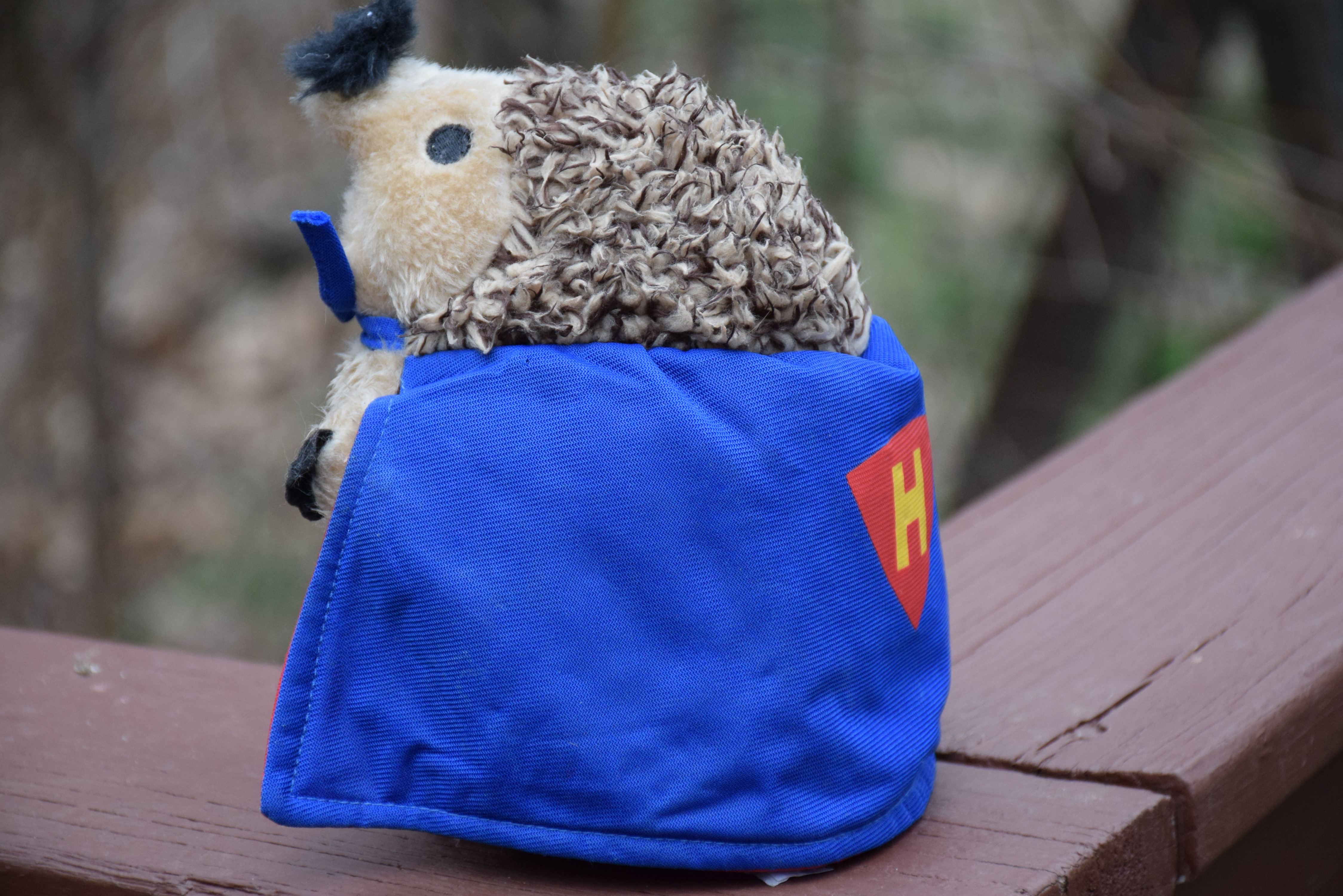 These shots depict our most recent Mr. Hedgehog – Hero Hedgehog! We also had Nurse/Chef Hedgehog and an undressed, characterless first hedgehog. Somewhere in-between there was a Farmer Hedgehog. He didn’t survive long enough to be photographed; must have been a period of stress in our lives. Once his denim overalls were “wedgied” he gave up and stuffing was everywhere.